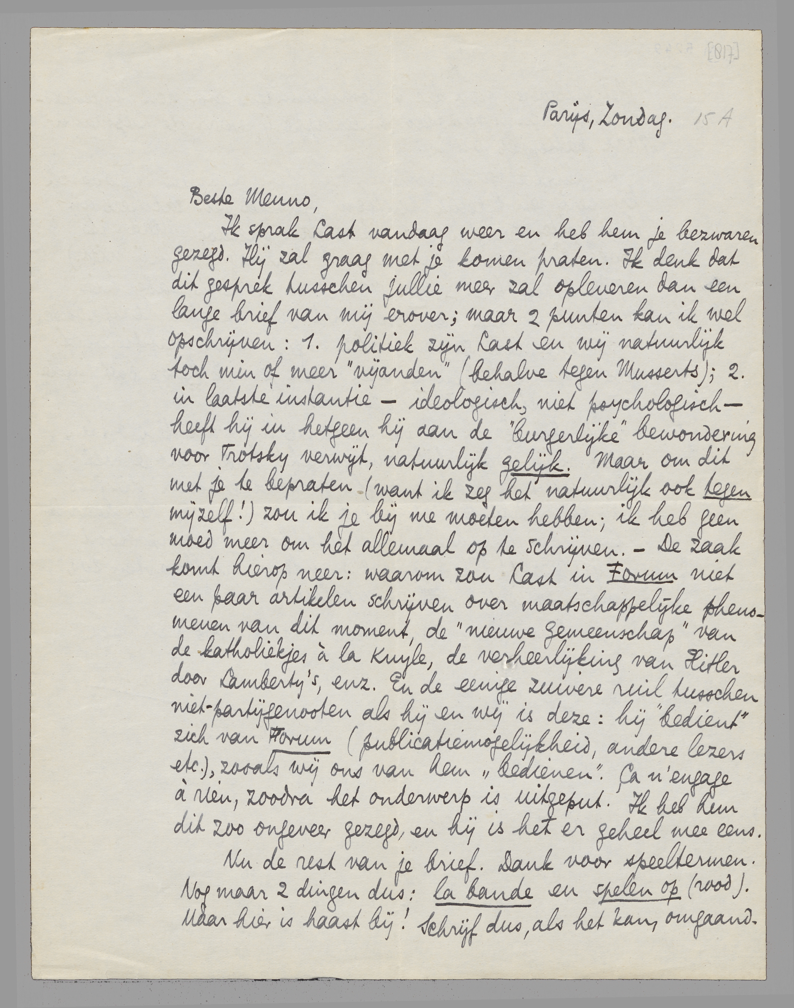 Ik sprak Last vandaag weer en heb hem je bezwaren gezegd. Hij zal graag met je komen praten. Ik denk dat dit gesprek tusschen jullie meer zal opleveren dan een lange brief van mij erover; maar 2 punten kan ik wel opschrijven: 1. politiek zijn Last en wij natuurlijk toch min of meer ‘vijanden’ (behalve tegen Musserts); 2. in laatste instantie - ideologisch, niet psychologisch - heeft hij in hetgeen hij aan de ‘burgerlijke’ bewondering voor Trotsky verwijt, natuurlijk gelijk. Maar om dit met je te bepraten (want ik zeg het natuurlijk ook tegen mijzelf!) zou ik je bij me moeten hebben; ik heb geen moed meer om het allemaal op te schrijven. - De zaak komt hierop neer: waarom zou Last in Forum niet een paar artikelen schrijven over maatschappelijke phenomenen van dit moment, de ‘nieuwe gemeenschap’ van de katholiekjes à la Kuyle, de verheerlijking van Hitler door Lamberty's, enz. En de eenige zuivere ruil tusschen niet-partijgenooten als hij en wij is deze: hij ‘bedient’ zich van Forum (publicatiemogelijkheid, andere lezers etc.), zooals wij ons van hem ‘bedienen’. Ça n'engage à rien, zoodra het onderwerp is uitgeput. Ik heb hem dit zoo ongeveer gezegd, en hij is het er geheel mee eens.