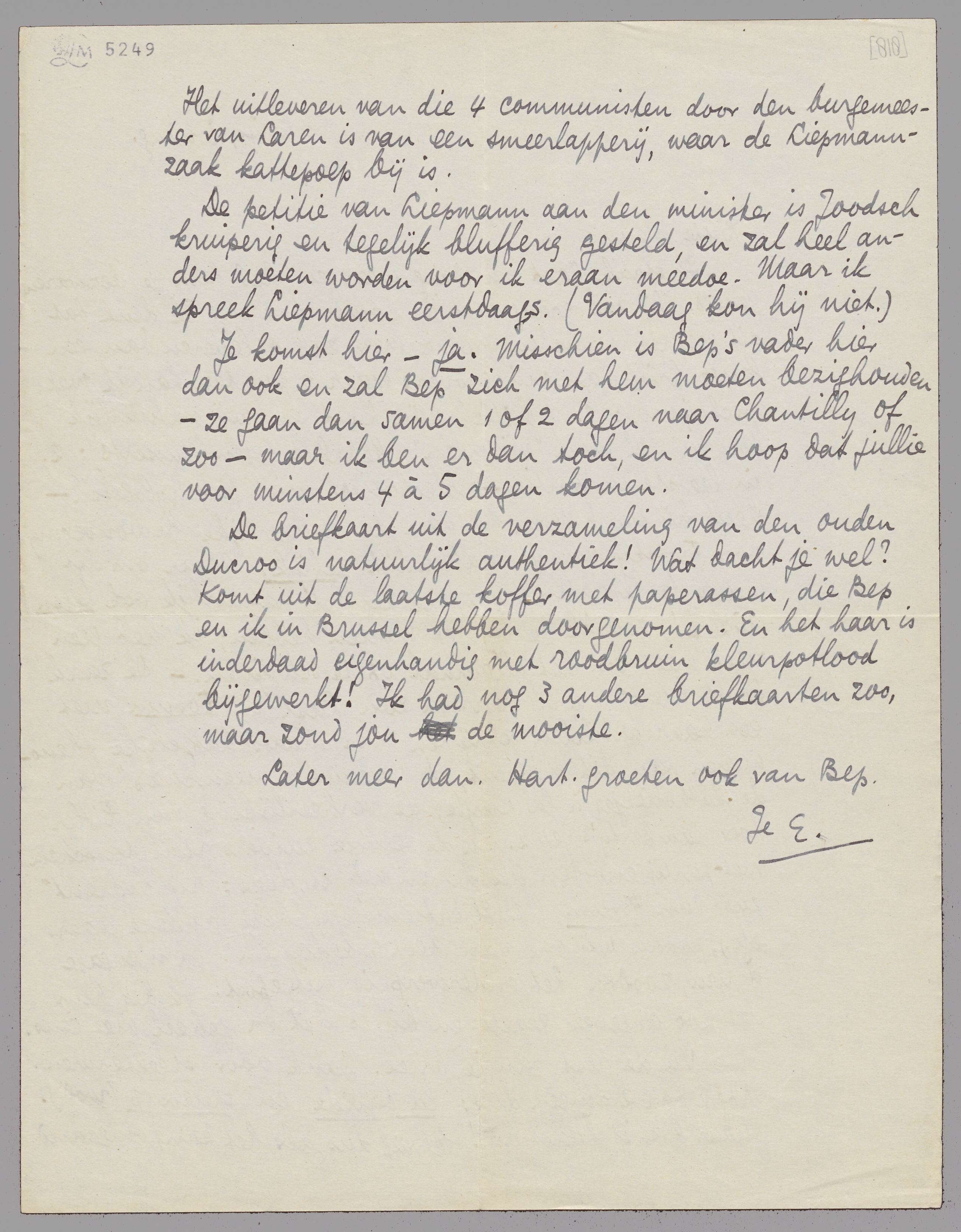 De petitie van Liepmann aan den minister is Joodsch kruiperig en tegelijk blufferig gesteld, en zal heel anders moeten worden voor ik eraan meedoe. Maar ik spreek Liepmann eerstdaags. (Vandaag kon hij niet.)