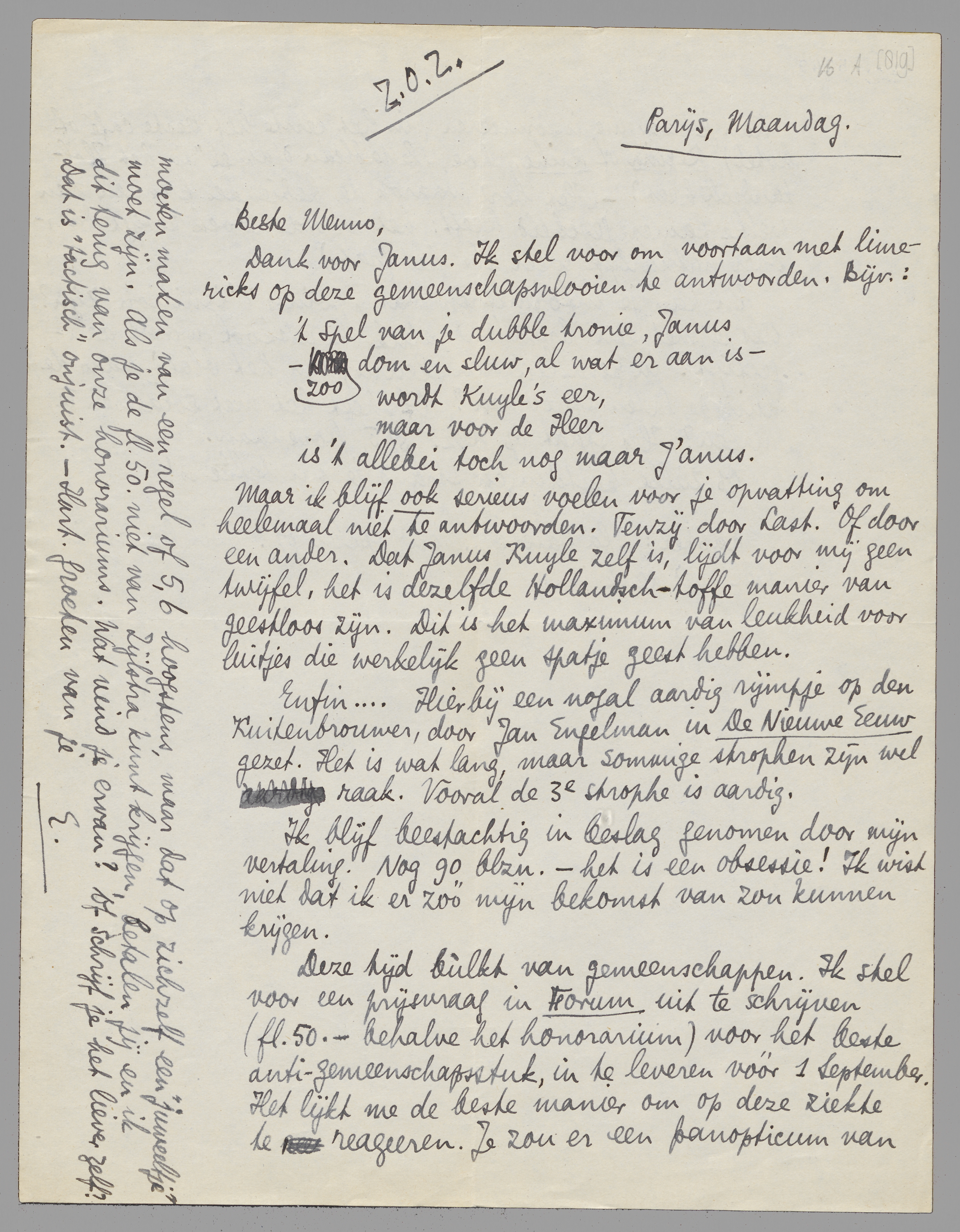 Deze tijd bùlkt van gemeenschappen. Ik stel voor een prijsvraag in Forum uit te schrijven (fl. 50.- behalve het honorarium) voor het beste anti-gemeenschapsstuk, in te leveren vóór 1 September. Het lijkt me de beste manier om op deze ziekte te reageeren. Je zou er een panopticum van moeten maken van een regel of 5, 6 hoogstens, maar dat op zichzelf een ‘juweeltje’ moet zijn. Als je de fl. 50 niet van Zijlstra kunt krijgen, betalen jij en ik dit terug van onze honorariums. Wat vind je ervan? Of schrijf je het liever zelf? Dat is ‘tactisch’ onjuist. - Hart. groeten van je