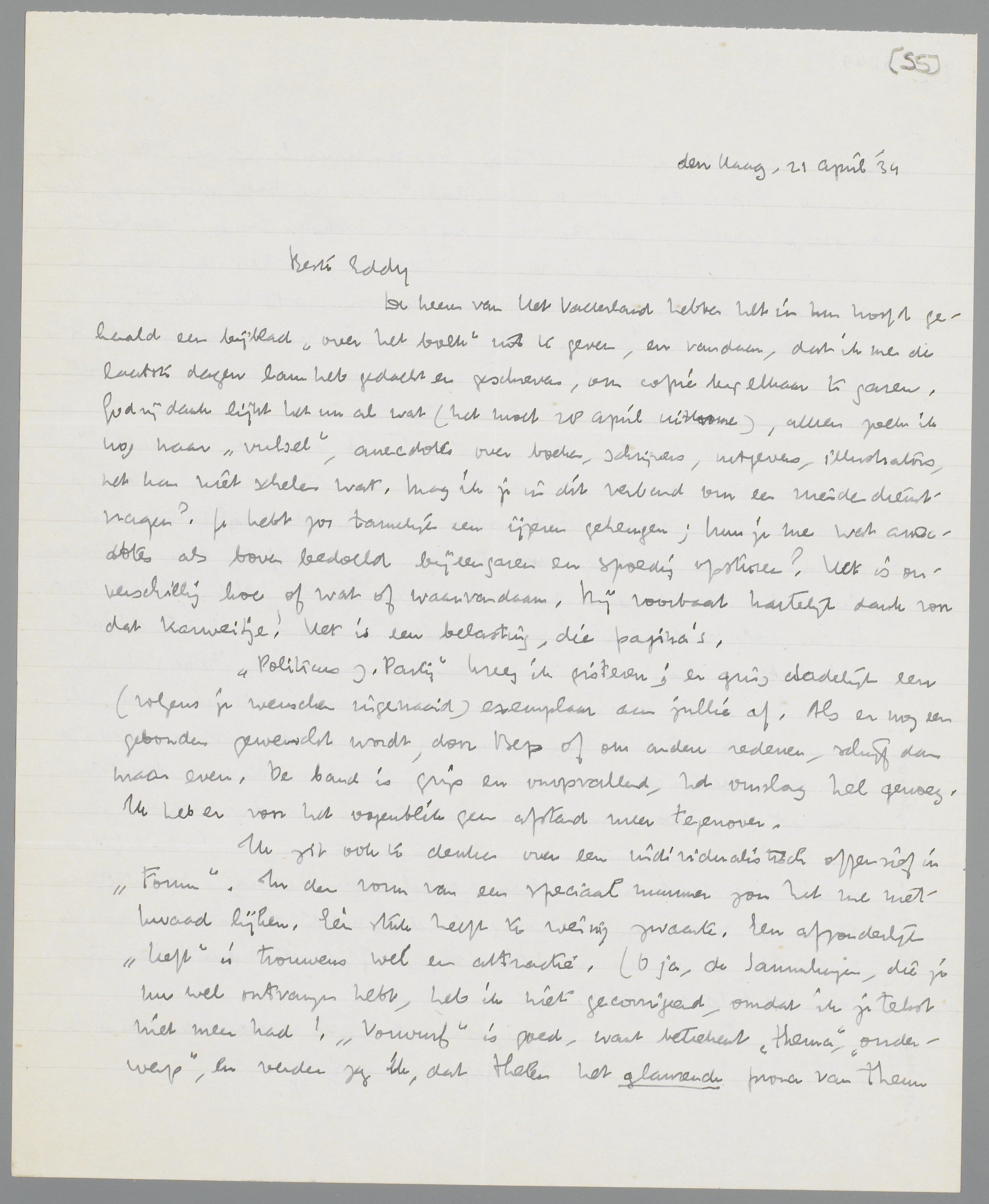 De heeren van Het Vaderland hebben het in hun hoofd gehaald een bijblad ‘over het boek’ uit te geven, en vandaar, dat ik me de laatste dagen lam heb gedacht en geschreven, om copie bij elkaar te garen. God zij dank lijkt het nu al wat (het moet 28 April uitkomen), alleen zoek ik nog naar ‘vulsel’, anecdotes over boeken, schrijvers, uitgevers, illustraties, het kan niet schelen wat. Mag ik je in dit verband om een vriendendienst vragen? Je hebt zoo tamelijk een ijzeren geheugen; kun je me wat anecdotes als boven bedoeld bijeen garen en spoedig opsturen? Het is onverschillig hoe of wat of waarvandaan. Bij voorbaat hartelijk dank voor dat karweitje! Het is een belasting, die pagina's.
