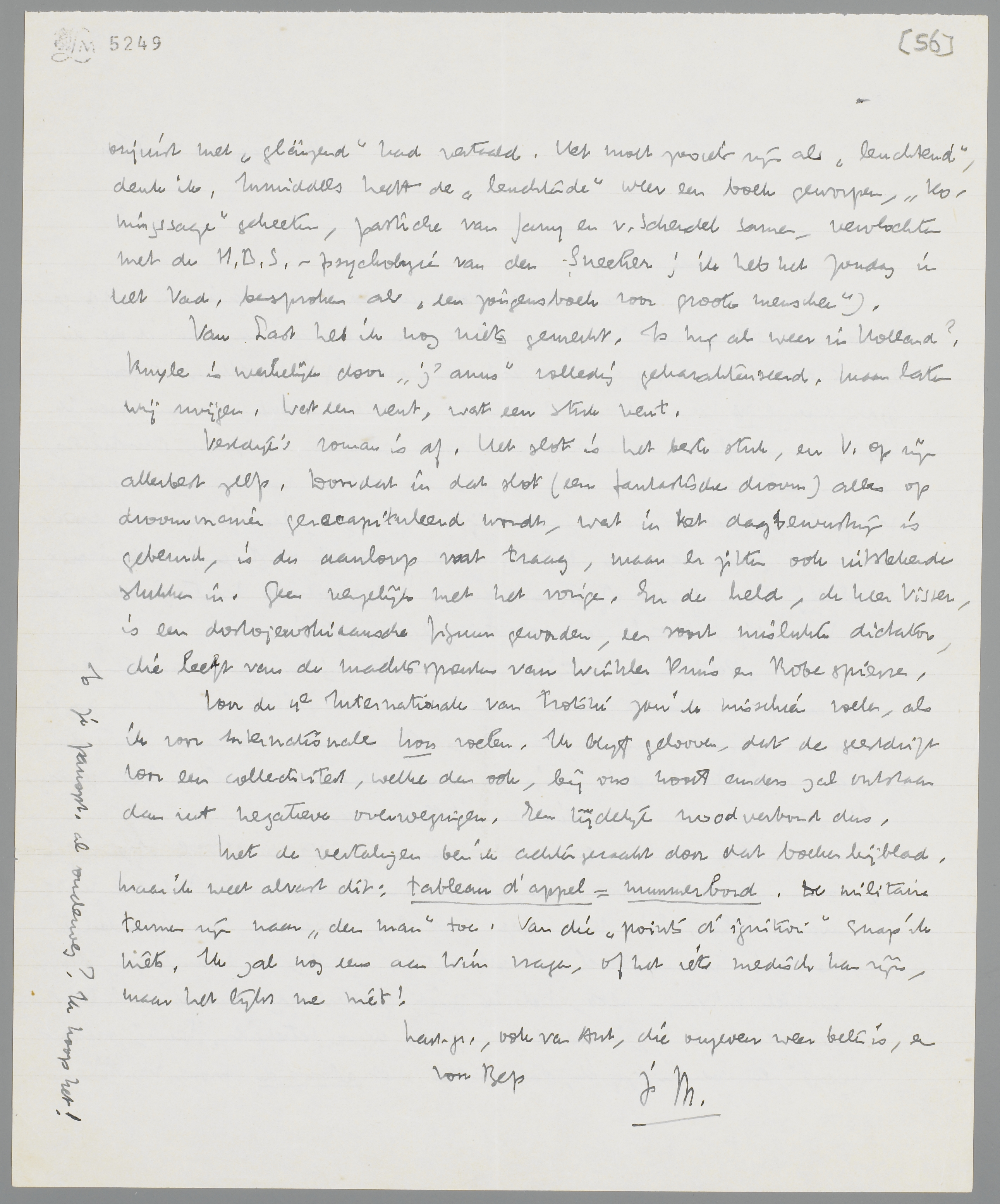 Ik zit ook te denken over een individualistisch offensief in Forum. In den vorm van een speciaal nummer zou het me niet kwaad lijken. Eèn stuk heeft te weinig zwaarte. Een afzonderlijk ‘Heft’ is trouwens wel een attractie. (O ja, de Sammlungen, die je nu wel ontvangen hebt, heb ik niet gecorrigeerd, omdat ik je tekst niet meer had! ‘Vorwurf’ is goed, want betekent, ‘thema’, ‘onderwerp’, en verder zag ik, dat Thelen het glanzende proza van Theun onjuist met ‘glänzend’ had vertaald. Het moet zooiets zijn als ‘leuchtend’, denk ik. Inmiddels heeft de ‘leuchtende’ weer een boek geworpen, Koningssage geheeten, pastiche van Jany en v. Schendel samen, vervlochten met de H.B.S.- psychologie van den Sneeker; ik heb het Zondag in Het Vad. besproken als ‘een jongensboek voor groote menschen’.