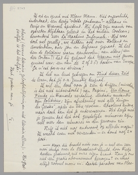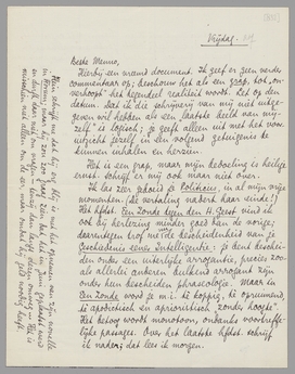 Ik las zeer geboeid je Politicus, in al mijn vrije momenten. (De vertaling nadert haar einde!) Het hfdst. Een Zonde tegen den H. Geest vind ik ook bij herlezing minder goed dan de vorige; daarentegen trof me nu de bescheidenheid van je Geschiedenis eener Intelligentie: je bent bescheiden onder een uiterlijke arrogantie, precies zooals allerlei anderen bulkend arrogant zijn onder hun bescheiden phraseologie. Maar in Een Zonde word je m.i. tè koppig, tè opruimend, tè apodictisch en aprioristisch ‘zonder hoogte’. Het betoog wordt monotoon, ondanks voortreffelijke passages. Over het laatste hfdst. schrijf ik nader; dat lees ik morgen.