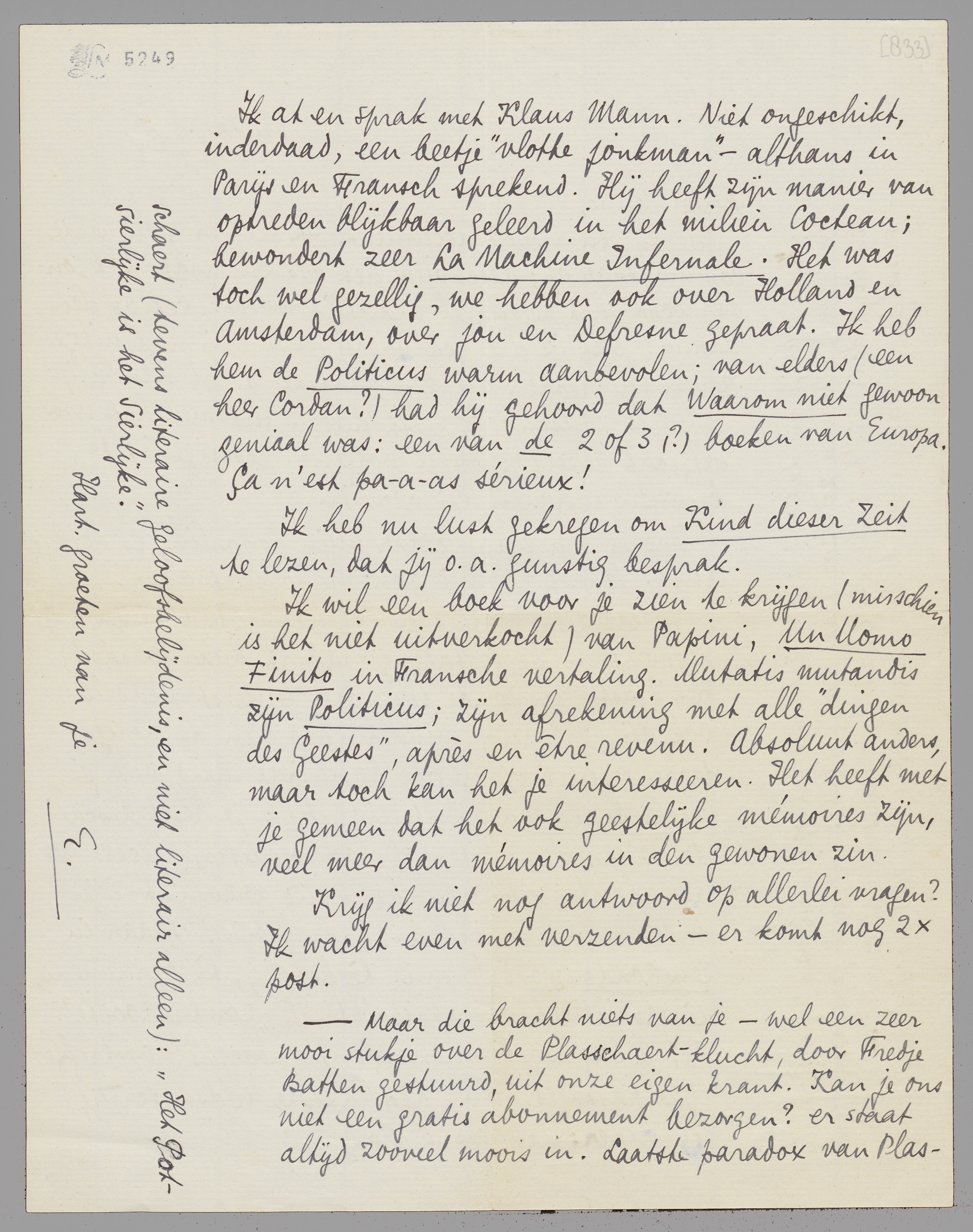 Ik at en sprak met Klaus Mann. Niet ongeschikt, inderdaad, een beetje ‘vlotte jonkman’ - althans in Parijs en Fransch sprekend. Hij heeft zijn manier van optreden blijkbaar geleerd in het milieu Cocteau; bewondert zeer La Machine Infernale. Het was toch wel gezellig, we hebben ook over Holland en Amsterdam, over jou en Defresne gepraat. Ik heb hem de Politicus warm aanbevolen; van elders (een heer Cordan?) had hij gehoord dat Waarom niet gewoon geniaal was: een van de 2 of 3(?) boeken van Europa. Ça n'est pa-a-as sérieux!