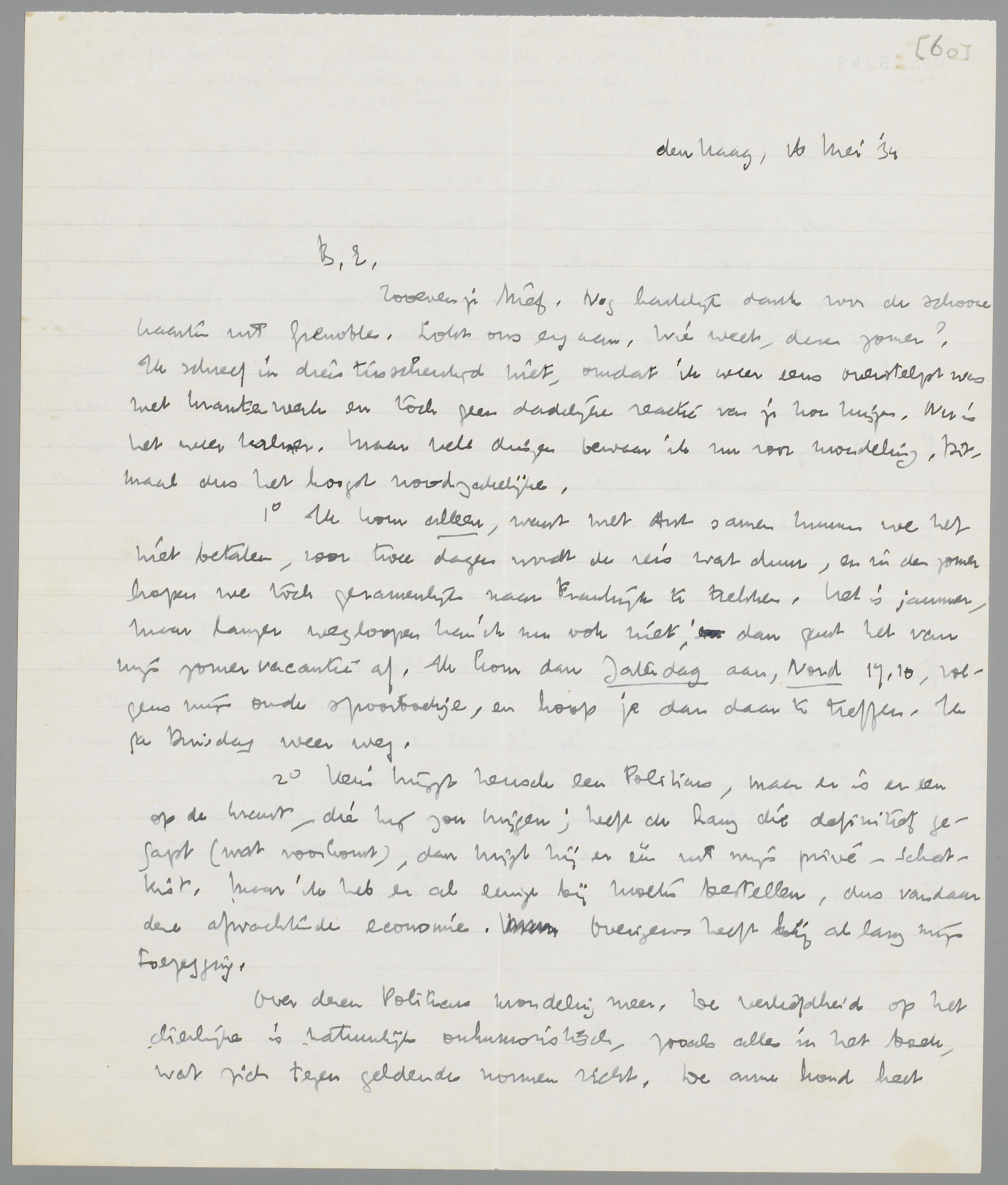 1e Ik kom alleen, want met Ant samen kunnen we het niet betalen, voor twee dagen wordt de reis wat duur, en in den zomer hopen we toch gezamenlijk naar Frankrijk te trekken. Het is jammer, maar langer wegloopen kan ik nu ook niet, dan gaat het van mijn zomervacantie af. Ik kom dan Zaterdag aan, Nord 17.10, volgens mijn oude spoorboekje, en hoop je dan daar te treffen. Ik ga Dinsdag weer weg.