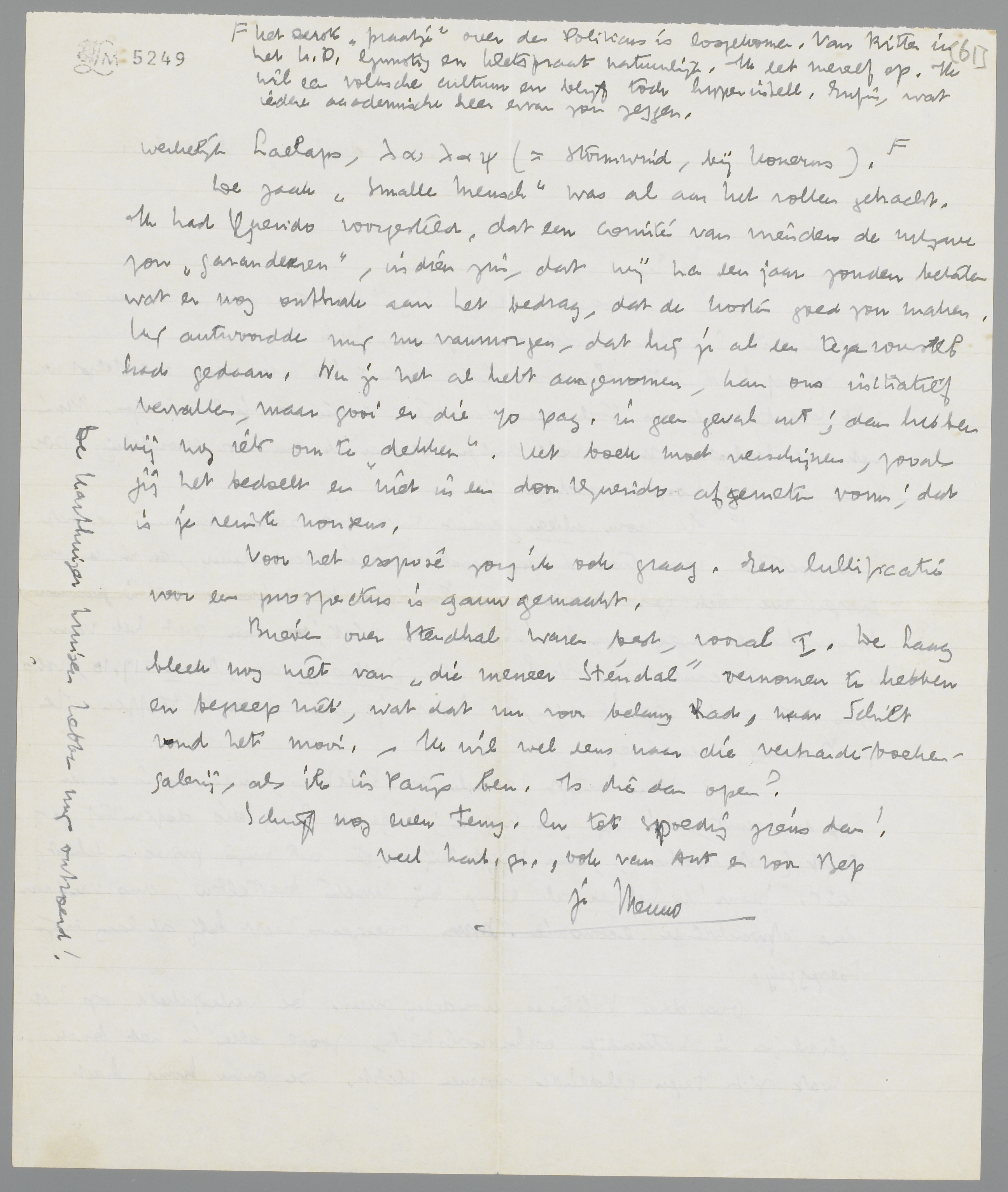 De zaak Smalle Mensch was al aan het rollen gebracht. Ik had Querido voorgesteld, dat een comité van vrienden de uitgave zou ‘garandeeren’, in dien zin, dat wij na een jaar zouden betalen wat er nog ontbrak aan het bedrag, dat de kosten goed zou maken. Hij antwoordde mij nu vanmorgen, dat hij je al een tegenvoorstel had gedaan. Nu je het al hebt aangenomen, kan ons initiatief vervallen, maar gooi er die 70 pag. in geen geval uit; dan hebben wij nog iets om te ‘dekken’. Het boek moet verschijnen, zooals jij het bedoelt en niet in een door Querido afgemeten vorm; dat is je reinste nonsens.