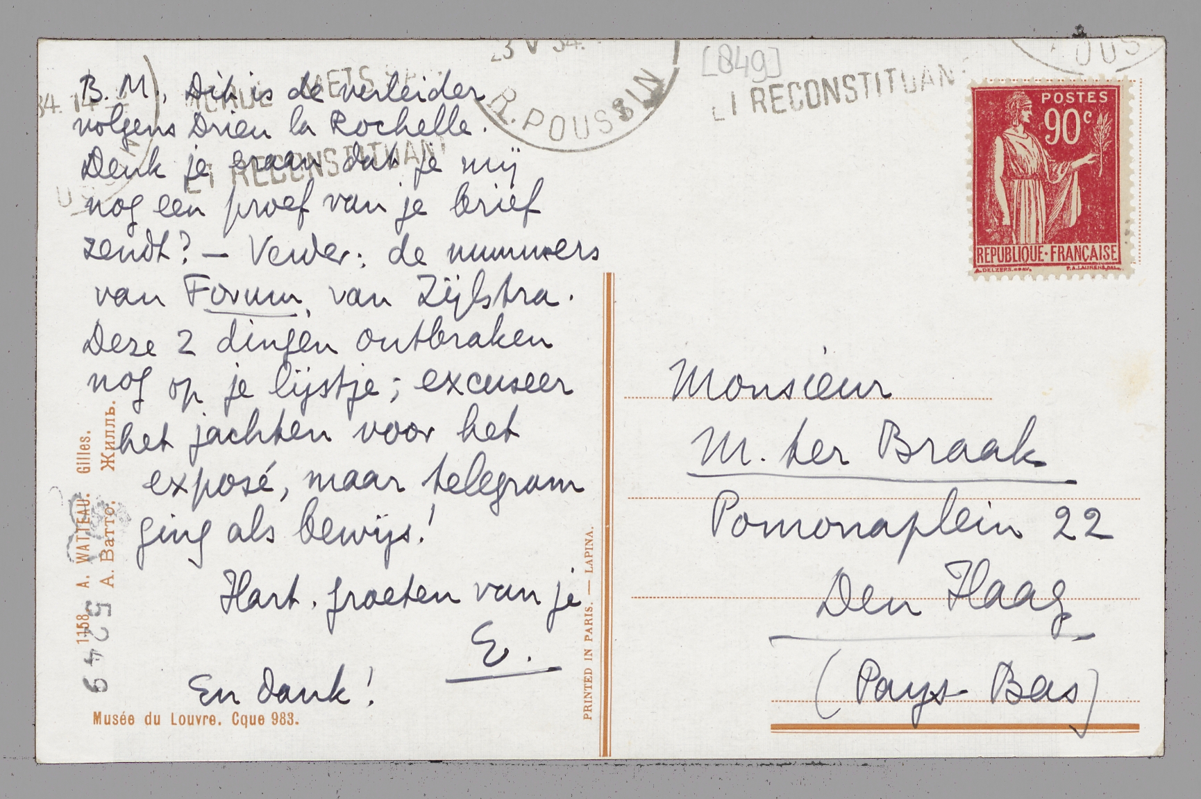 Dit is de verleider volgens Drieu la Rochelle. Denk je eraan dat je mij nog een proef van je brief zendt? - Verder: de nummers van Forum, van Zijlstra. Deze 2 dingen ontbraken nog op je lijstje; excuseer het jachten voor het exposé, maar telegram ging als bewijs!