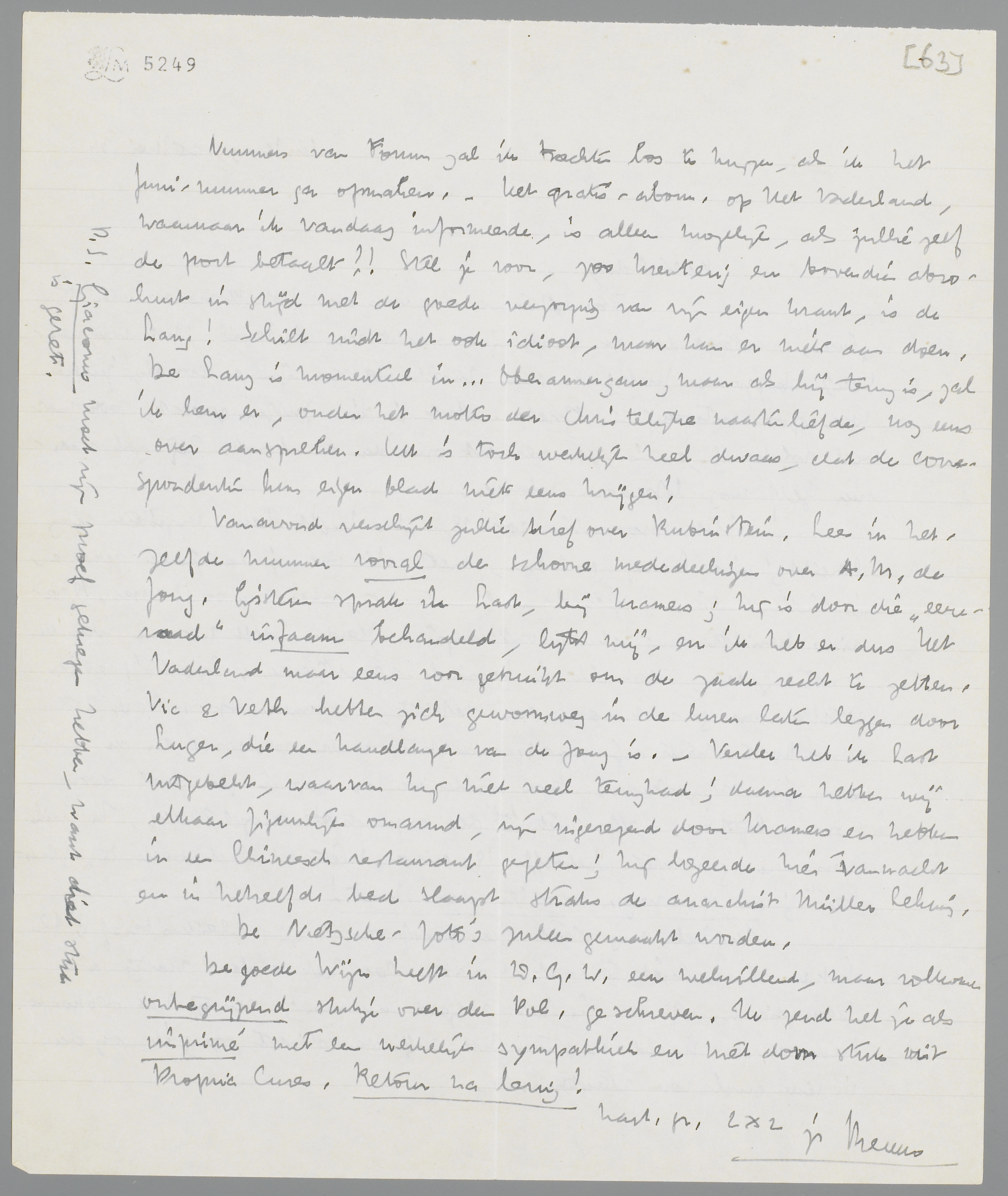 Vanavond verschijnt jullie brief over Rubinstein. Lees in hetzelfde nummer vooral de schoone mededeelingen over A.M. de Jong. Gisteren sprak ik Last, bij Kramers; hij is door die ‘eereraad’ infaam behandeld, lijkt mij, en ik heb er dus Het Vaderland maar eens voor gebruikt om de zaak recht te zetten. Vic & Veth hebben zich gewoonweg in de luren laten leggen door Luger, die een handlanger van de Jong is. - Verder heb ik Last uitgebekt, waarvan hij niet veel terug had; daarna hebben wij elkaar figuurlijk omarmd, zijn ingezegend door Kramers en hebben in een Chineesch restaurant gegeten; hij logeerde hier vannacht en in hetzelfde bed slaapt straks de anarchist Müller Lehning. De Nietzsche-foto's zullen gemaakt worden.