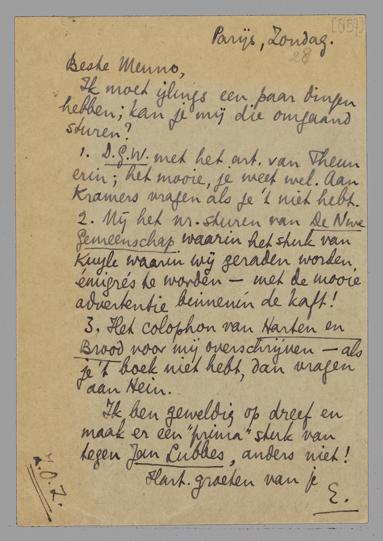 | 2. | Mij het nr. sturen van De Nwe Gemeenschap waarin het stuk van Kuyle waarin wij geraden worden émigrés te worden - met de mooie advertentie binnenin de kaft! |