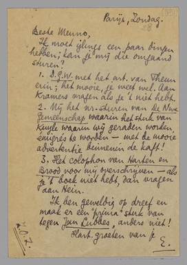 Ik zie het opstel nu duidelijk voor me: je krijgt eerst 9 of 10 blzn. getypt voor Forum (dus ± 18 blzn?); dat is wat Jan Lubbes heet. - Daarna begin ik aan een nieuw stuk: De Emigrés of zoo; dat je in ‘Europa’ zou kunnen opnemen, en waarin ik Muss., Keys., etc. afdoe. Dit kan veel langer worden, dat hangt van mijn lectuur af. Misschien moet je 't in 2 keer plaatsen. Reserveer in ieder geval Juli, Aug. en Sept. voor me - ook met het oog op de boekuitgave!
