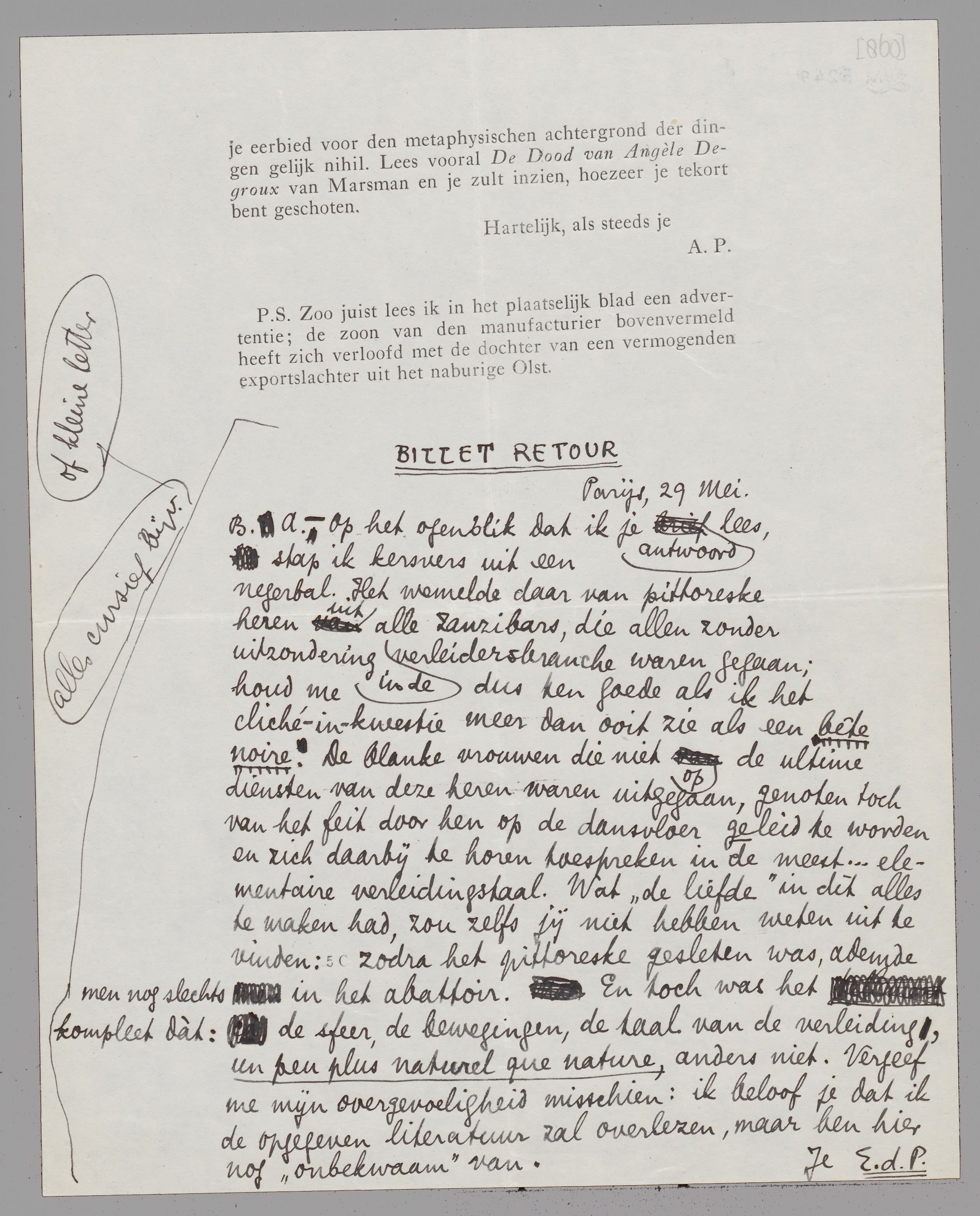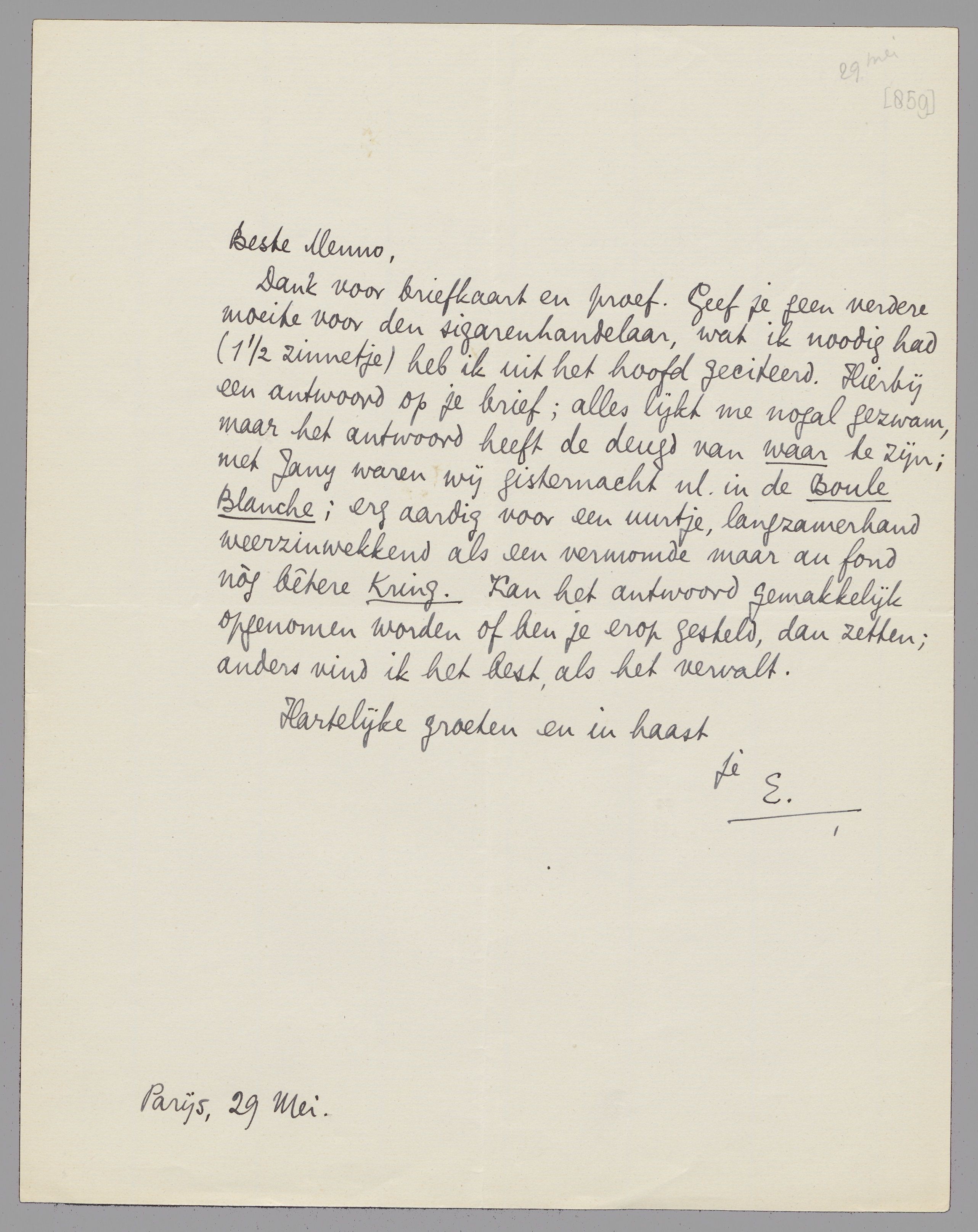Dank voor briefkaart en proef. Geef je geen verdere moeite voor den sigarenhandelaar, wat ik noodig had (1½ zinnetje) heb ik uit het hoofd geciteerd. Hierbij een antwoord op je brief; alles lijkt me nogal gezwam, maar het antwoord heeft de deugd van waar te zijn; met Jany waren wij gisterennacht nl. in de Boule Blanche; erg aardig voor een uurtje, langzamerhand weerzinwekkend als een vermomde maar au fond nòg bêtere Kring. Kan het antwoord gemakkelijk opgenomen worden of ben je erop gesteld, dan zetten; anders vind ik het best, als het vervalt.