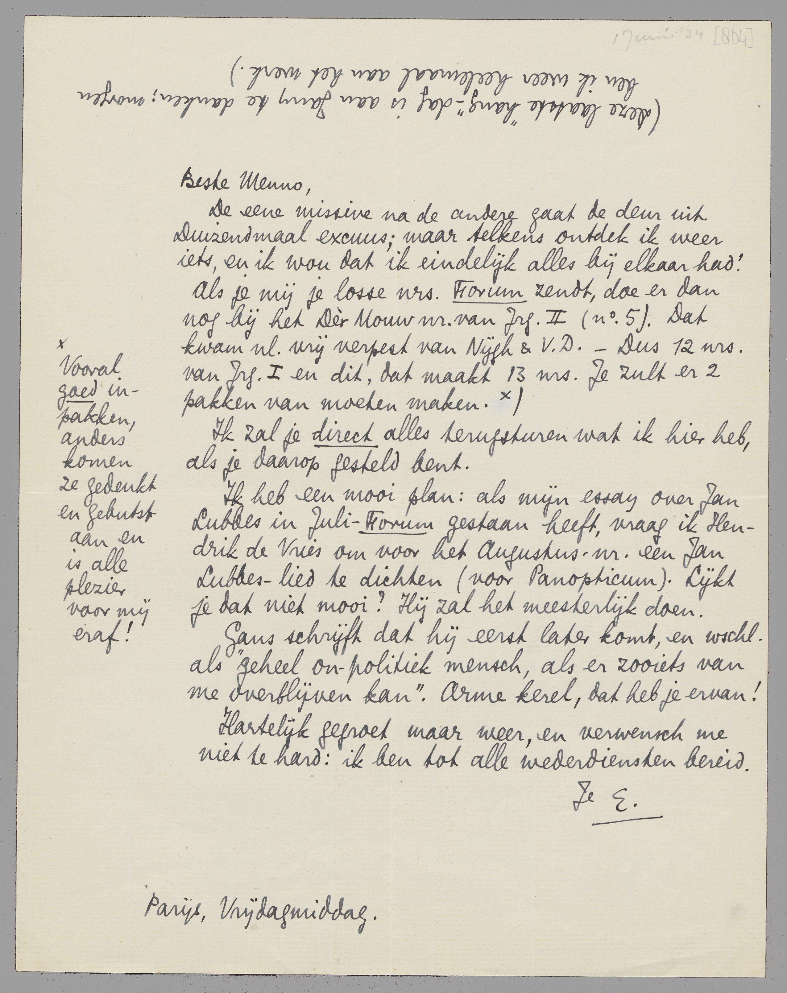 Als je mij je losse nrs. Forum zendt, doe er dan nog bij het Dèr Mouw nr. van Jrg. II (no. 5). Dat kwam nl. vrij verpest van Nijgh & V.D. - Dus 12 nrs. van Jrg. I en dit, dat maakt 13 nrs. Je zult er 2 pakken van moeten maken. [Vooral goed inpakken, anders komen ze gedeukt en gebutst aan en is alle plezier voor mij eraf!]