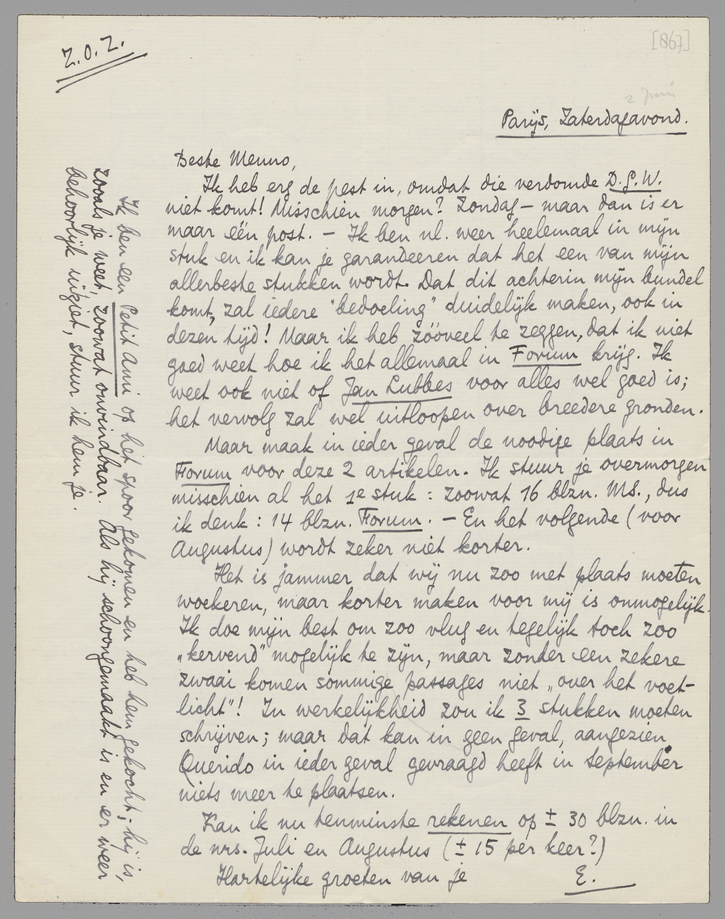 Het is jammer dat wij nu zoo met plaats moeten woekeren, maar korter maken voor mij is onmogelijk. Ik doe mijn best om zoo vlug en tegelijk toch zoo ‘kervend’ mogelijk te zijn, maar zonder een zekere zwaai komen sommige passages niet ‘over het voetlicht’! In werkelijkheid zou ik 3 stukken moeten schrijven; maar dat kan in geen geval, aangezien Querido in ieder geval gevraagd heeft in September niets meer te plaatsen.