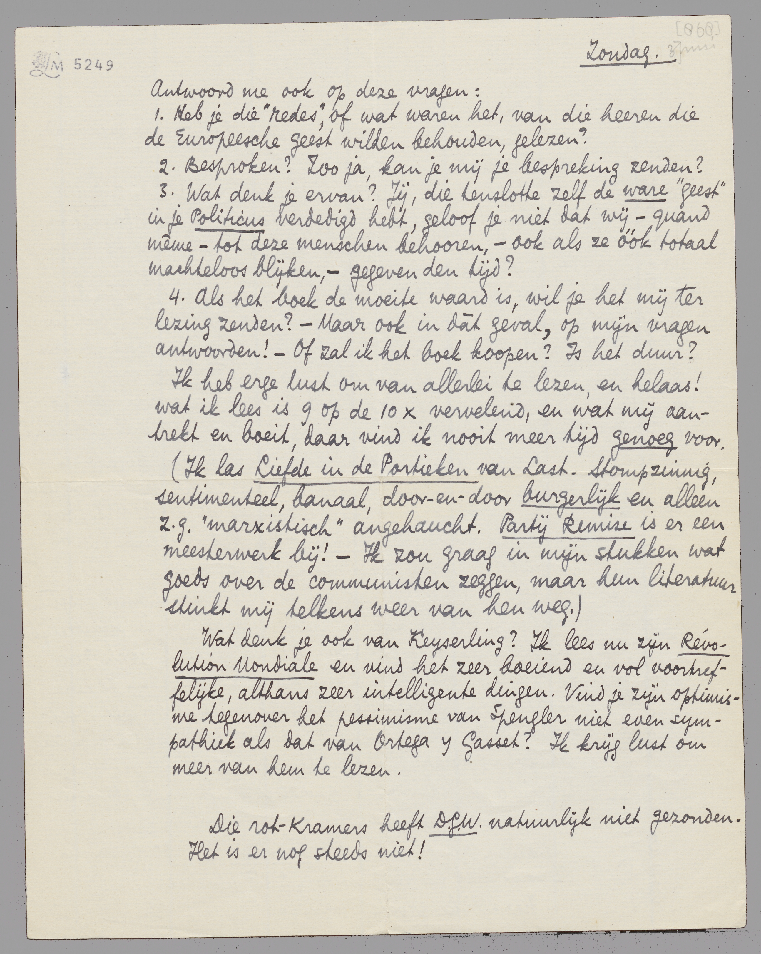 (Ik las Liefde in de Portieken van Last. Stompzinnig, sentimenteel, banaal, door-en-door burgerlijk en alleen z.g. ‘marxistisch’ angehaucht. Partij Remise is er een meesterwerk bij! - Ik zou graag in mijn stukken wat goeds over de communisten zeggen, maar hun literatuur stinkt mij telkens weer van hen weg.)