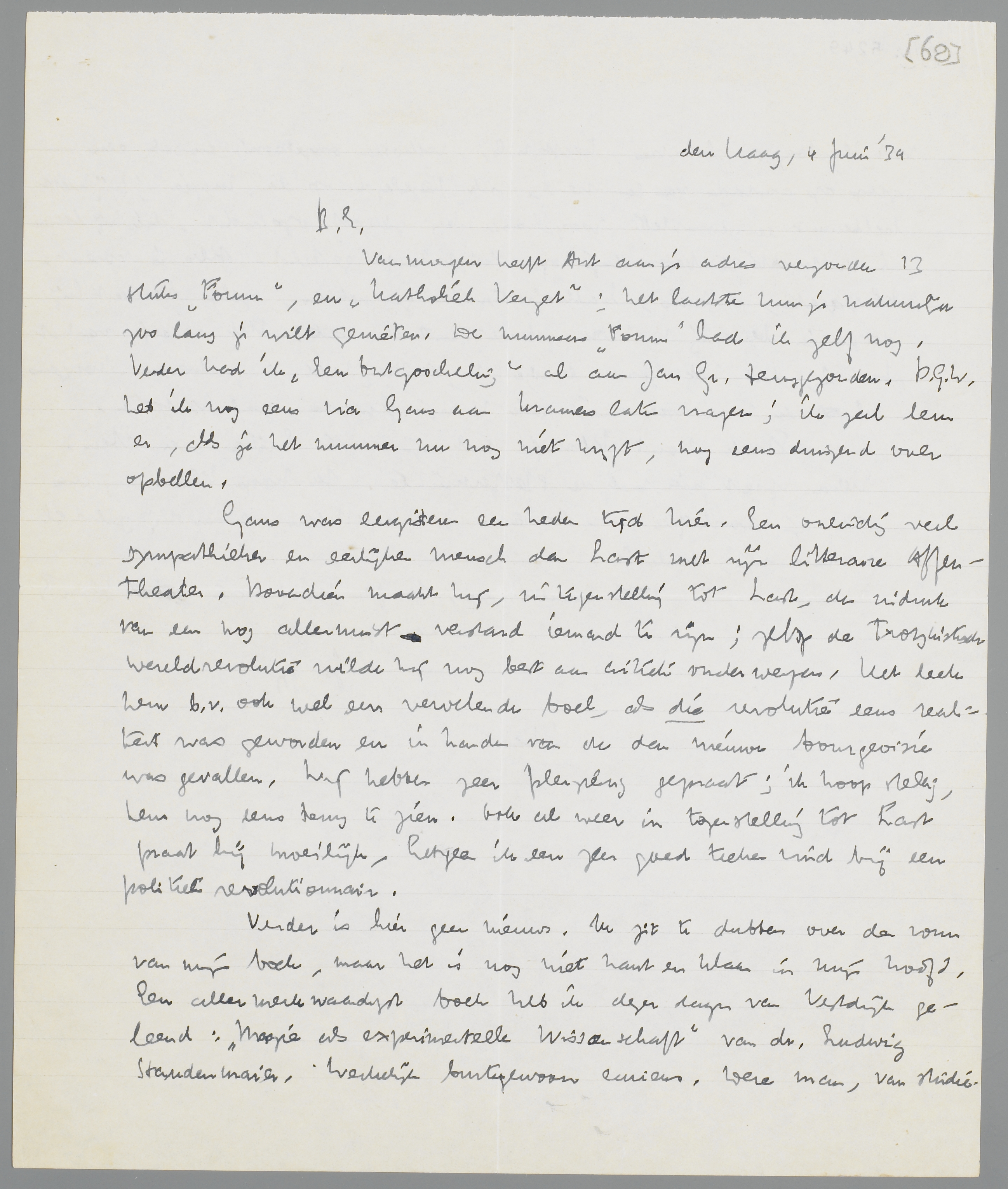 Gans was eergisteren een heelen tijd hier. Een oneindig veel sympathieker en eerlijker mensch dan Last met zijn litteraire Affentheater. Bovendien maakt hij, in tegenstelling tot Last, den indruk van een nog allerminst verstard iemand te zijn; zelfs de Trotzkistische wereldrevolutie wilde hij nog best aan critiek onderwerpen. Het leek hem b.v. ook wel een vervelende boel, als die revolutie eens realiteit was geworden en in handen van de dan nieuwe bourgeoisie was gevallen. Wij hebben zeer pleizierig gepraat; ik hoop stellig, hem nog eens terug te zien. Ook al weer in tegenstelling tot Last praat hij moeilijk, hetgeen ik een zeer goed teeken vind bij een politiek revolutionnair.