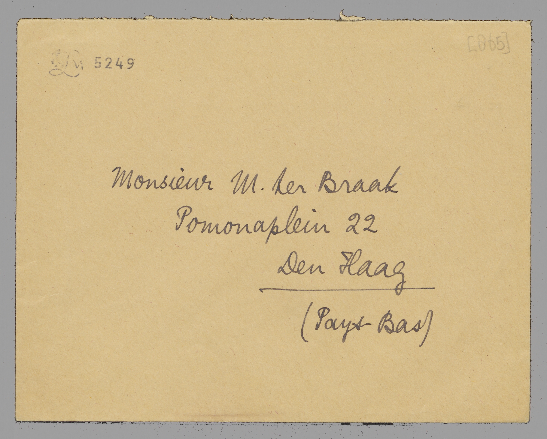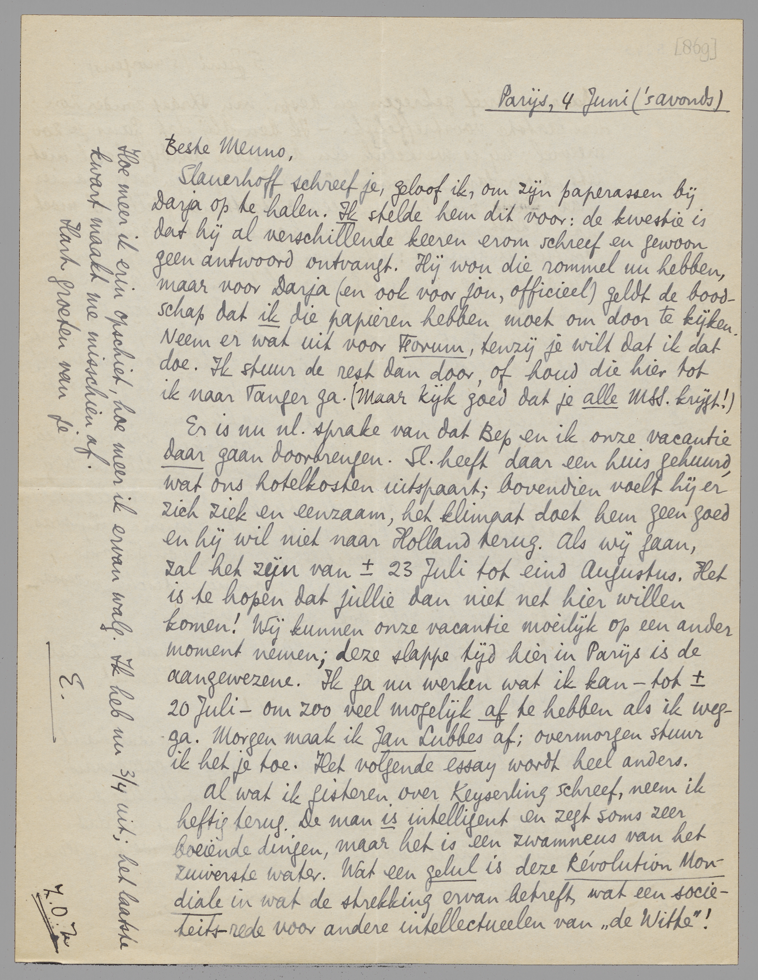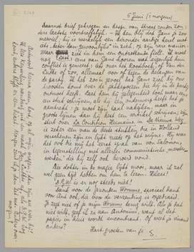 Er is nu nl. sprake van dat Bep en ik onze vacantie daar gaan doorbrengen. Sl. heeft daar een huis gehuurd, wat ons hotelkosten uitspaart; bovendien voelt hij er zich ziek en eenzaam, het klimaat doet hem geen goed en hij wil niet naar Holland terug. Als wij gaan, zal het zijn van ± 23 Juli tot eind Augustus. Het is te hopen dat jullie dan niet net hier willen komen! Wij kunnen onze vacantie moeilijk op een ander moment nemen; deze slappe tijd hier in Parijs is de aangewezene. Ik ga nu werken wat ik kan - tot ± 20 Juli - om zoo veel mogelijk af te hebben als ik wegga. Morgen maak ik Jan Lubbes af; overmorgen stuur ik het je toe. Het volgende essay wordt heel anders.