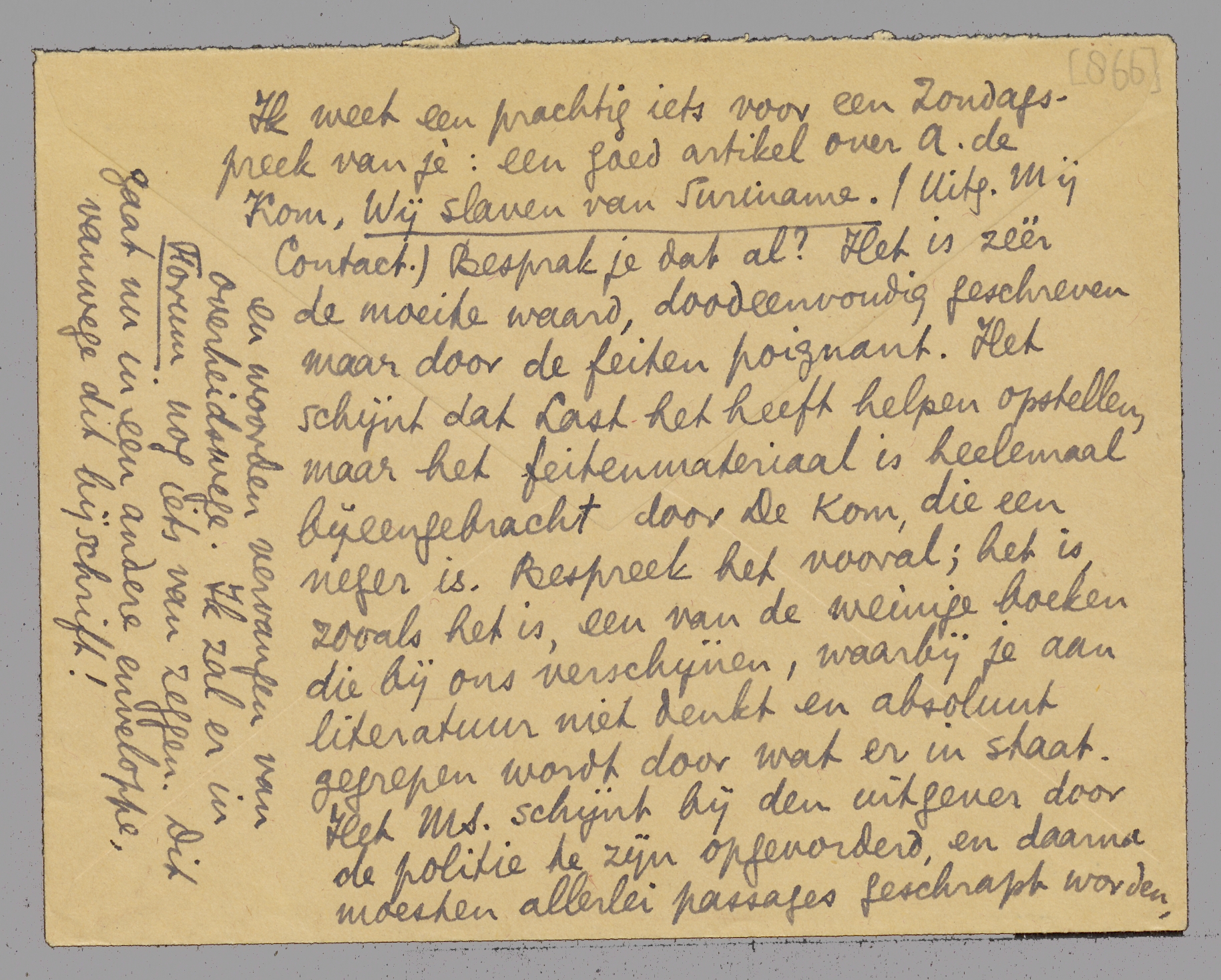Ik weet een prachtig iets voor een Zondagspreek van je: een goed artikel over A. de Kom, Wij slaven van Suriname. (Uitg. Mij Contact.) Besprak je dat al? Het is zéér de moeite waard, doodeenvoudig geschreven maar door de feiten poignant. Het schijnt dat Last het heeft helpen opstellen, maar het feitenmateriaal is heelemaal bijeengebracht door De Kom, die een neger is. Bespreek het vooral; het is, zooals het is, een van de weinige boeken die bij ons verschijnen, waarbij je aan literatuur niet denkt en absoluut gegrepen wordt door wat er in staat. Het MS. schijnt bij den uitgever door de politie te zijn opgevorderd, en daarna moesten allerlei passages geschrapt worden, en woorden vervangen van overheidswege. Ik zal er in Forum nog iets van zeggen. Dit gaat nu in een andere enveloppe, vanwege dit bijschrift!