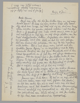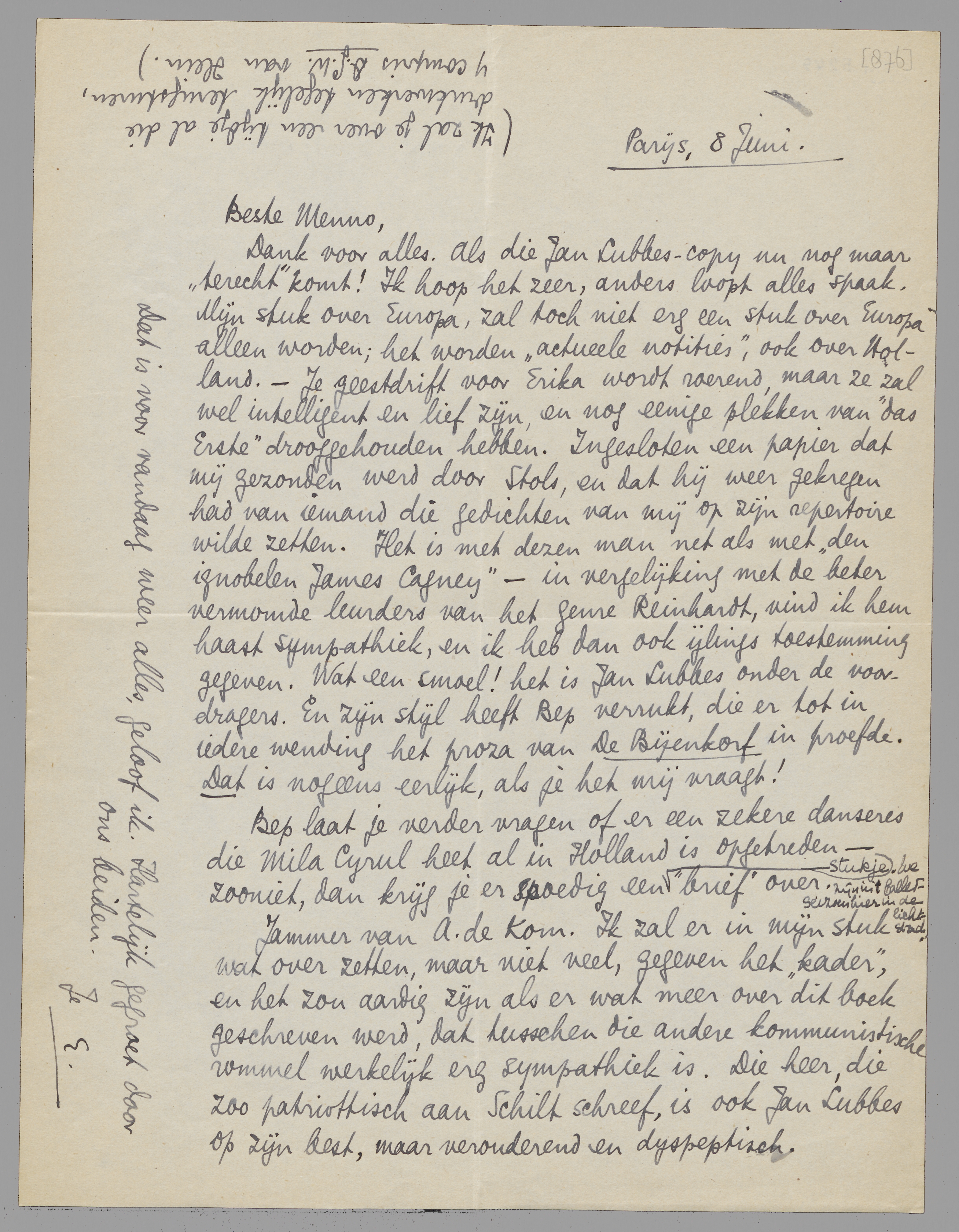 Dank voor alles. Als die Jan Lubbes-copy nu nog maar ‘terecht’ komt! Ik hoop het zeer, anders loopt alles spaak. Mijn stuk over Europa, zal toch niet erg een stuk over Europa alleen worden; het worden ‘actueele notities’, ook over Holland. - Je geestdrift voor Erika wordt roerend, maar ze zal wel intelligent en lief zijn, en nog eenige plekken van ‘das Erste’ drooggehouden hebben. Ingesloten een papier dat mij gezonden werd door Stols, en dat hij weer gekregen had van iemand die gedichten van mij op zijn repertoire wilde zetten. Het is met dezen man net als met ‘den ignobelen James Cagney’ - in vergelijking met de beter vermomde leurders van het genre Reinhardt, vind ik hem haast sympathiek, en ik heb dan ook ijlings toestemming gegeven. Wat een smoel! het is Jan Lubbes onder de voordragers. En zijn stijl heeft Bep verrukt, die er tot in iedere wending het proza van De Bijenkorf in proefde. Dat is nogeens eerlijk, als je het mij vraagt!