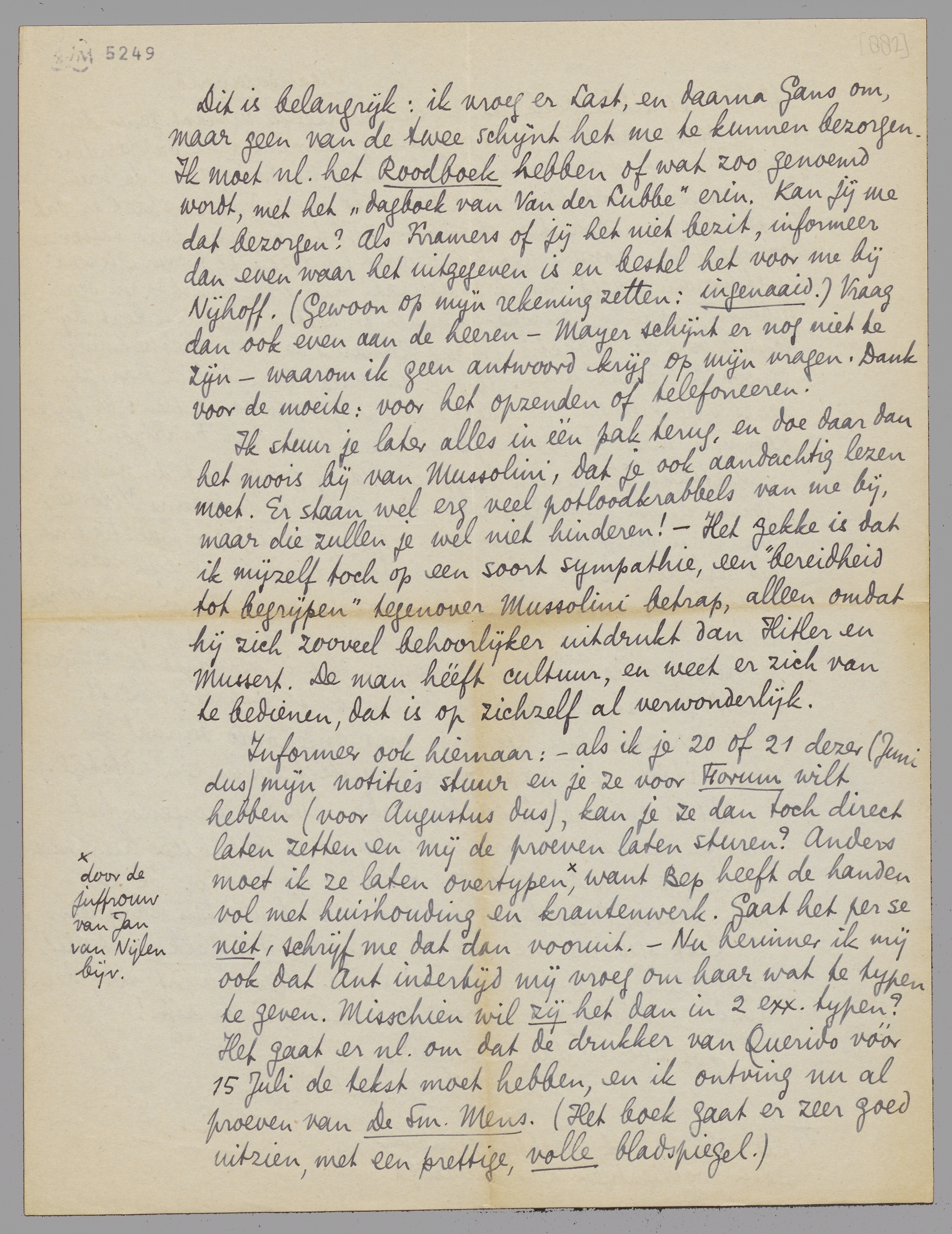 Ik stuur je later alles in één pak terug, en doe daar dan het moois bij van Mussolini, dat je ook aandachtig lezen moet. Er staan wel erg veel potloodkrabbels van me bij, maar die zullen je wel niet hinderen! - Het gekke is dat ik mijzelf toch op een soort sympathie, een ‘bereidheid tot begrijpen’ tegenover Mussolini betrap, alleen omdat hij zich zooveel behoorlijker uitdrukt dan Hitler en Mussert. De man hééft cultuur, en weet er zich van te bedienen, dat is op zichzelf al verwonderlijk.