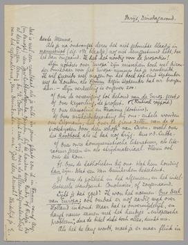Daarnet je brief over Van Duinkerken, maar het stuk van den man zelf was er niet bij. Wel de aanhef voor Jan Lubbes, die heel goed is zoo. Vergeet je nu vooral niet mij het 1½ blaadje ms. te zenden dat wegviel; de 2 blaadjes die getypt zijn mogen ter prullemand.