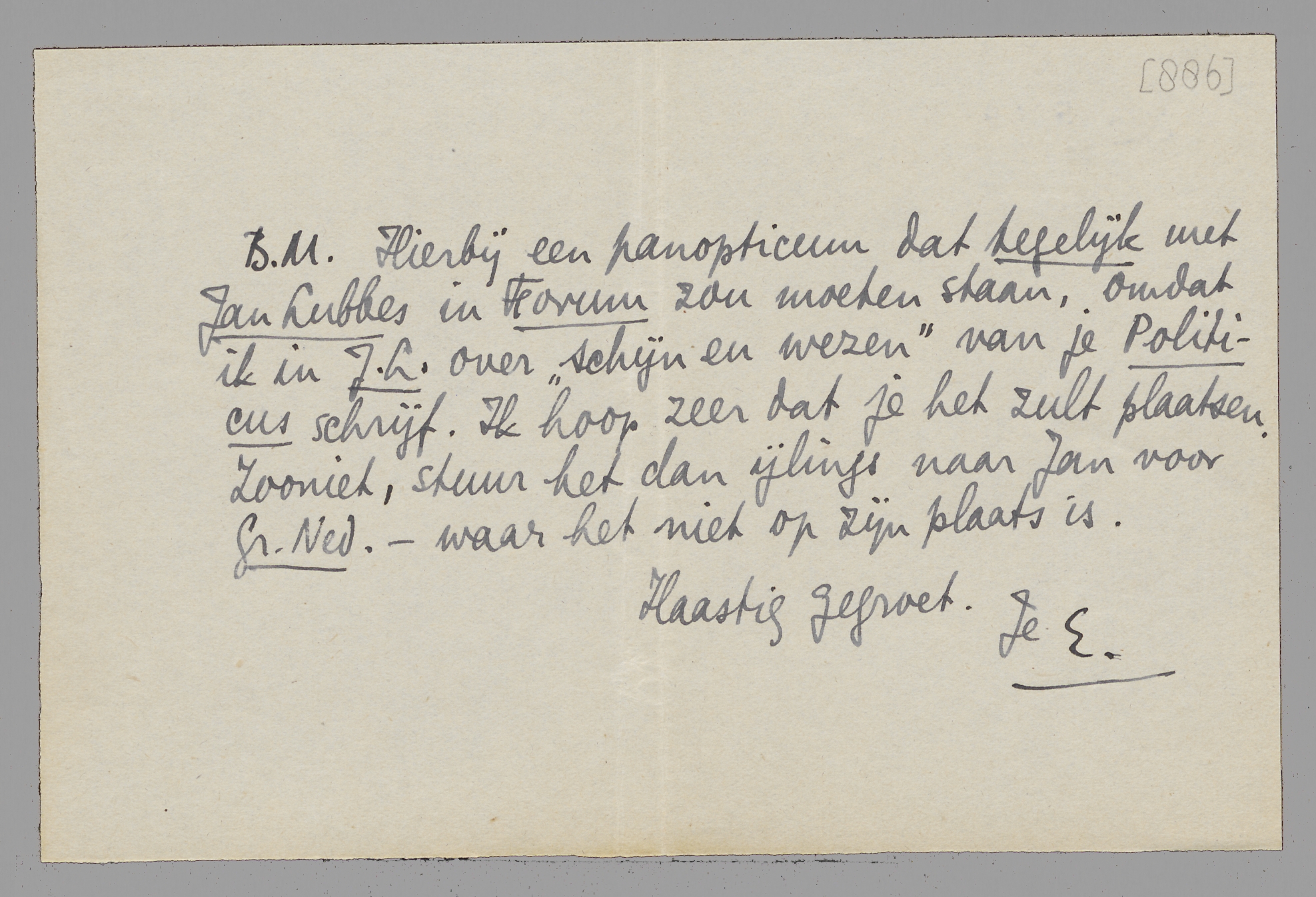 Hierbij een panopticum dat tegelijk met Jan Lubbes in Forum zou moeten staan, omdat ik in J.L. over ‘schijn en wezen’ van je Politicus schrijf. Ik hoop zeer dat je het zult plaatsen. Zooniet, stuur het dan ijlings naar Jan voor Gr. Ned. - waar het niet op zijn plaats is. Haastig gegroet