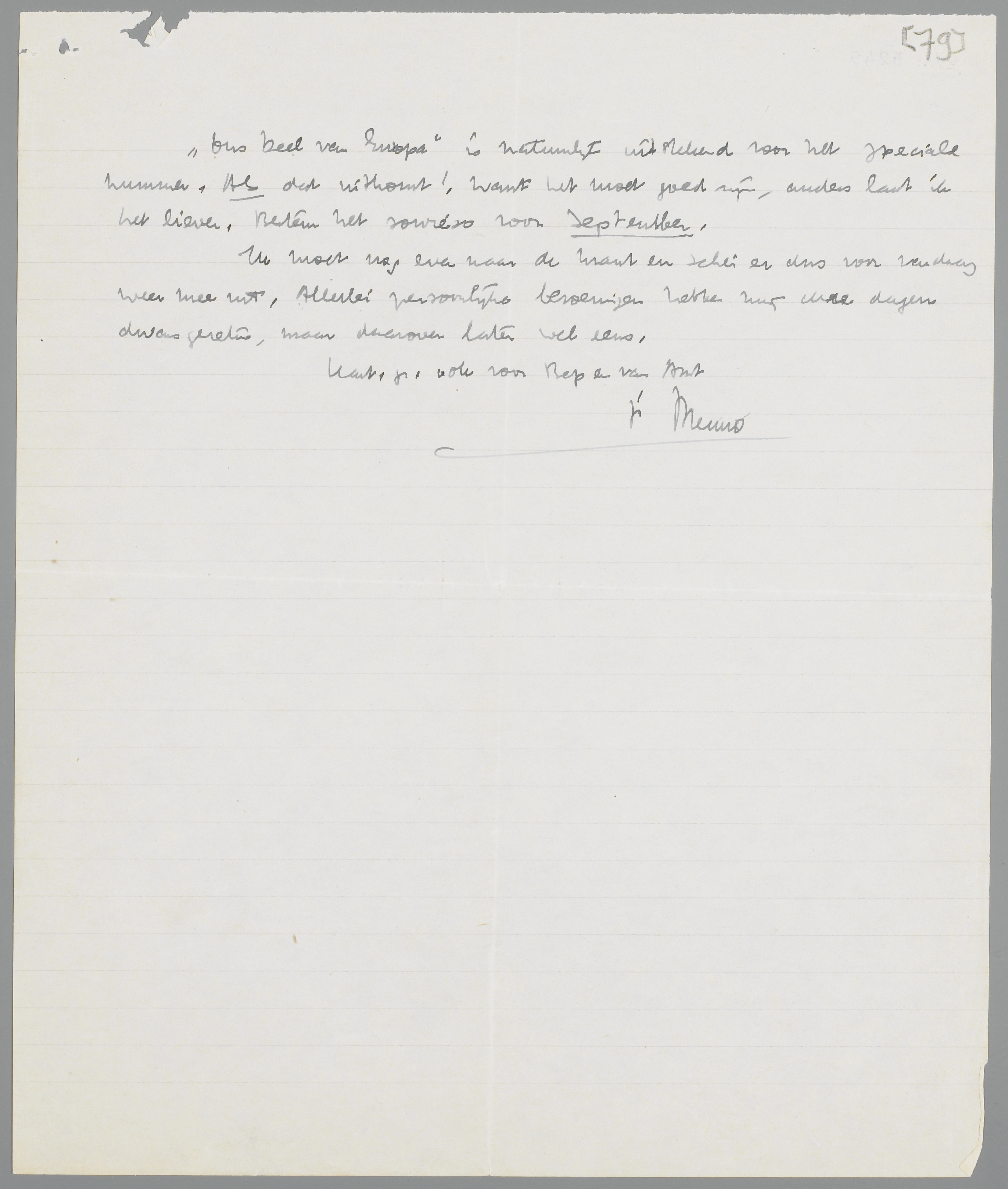 Hierbij stuur ik je 1 pag. terug van het beginstuk J.L. De andere helft stond, geloof ik, op den achterkant van een ander gedeelte en is in ieder geval weg, tot mijn grooten spijt. Ik hoop, dat je er geen al te belangrijke dingen op had staan. - Vic heeft, ‘zij het aarzelend’, voor J.L. gestemd; hij apprecieerde het zeer, schreef hij mij, maar hij vond het jammer, dat je ‘eigen kleine geraaktheid’ telkens het betoog verzwakte. Er stond ook eenig ‘onjuist geroddel’ in. Ik zou al deze opmerkingen direct accepteeren uit den mond van iemand, die zelf een krachtige, ongeraakte, onroddelbare persoonlijkheid is, maar helaas, Vic is Vic niet meer; hij wordt, geloof ik, met den dag meer ‘de man van de N.R.C.’. De ironie van het lot wil, dat hij ook dat nog beroerd schijnt te zijn. Hij heeft alleen juist aangeteekend, dat Coolen het regionalisme niet verdedigd heeft, althans dat later op grond van een fout krantenverslag heeft geloochend. Maak daar in de proef dus iets anders van; natuurlijk blijkt het uit zijn houding toch, alleen de tekst heeft hij weerlegd.