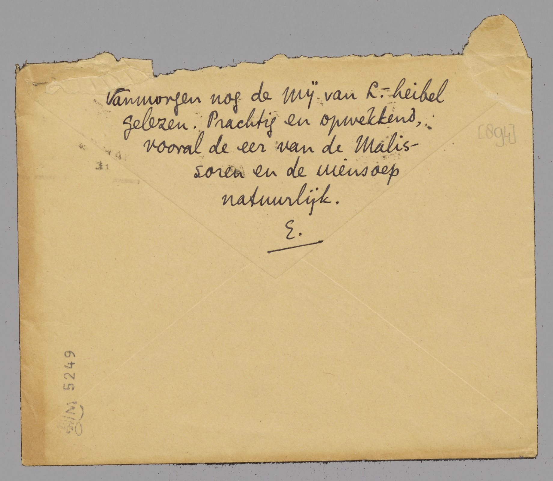 Ken je Ilja Ehrenbourg, Vus par un auteur de l'U.R.R.S. (over Duhamel, Gide, Malraux, etc.) In de N.R.F. juist verschenen. Is het niet iets voor een preek van je? In dat geval afspreken met Jan, die er toch niet den aangewezen man voor is, dat hij het niet doet en het boek ter bespreking aanvragen aan L. Chevasson, N.R.F., 5 rue Sébastien Bottin, Paris 7. Je hebt het dan wschl. omgaand.
