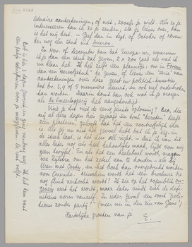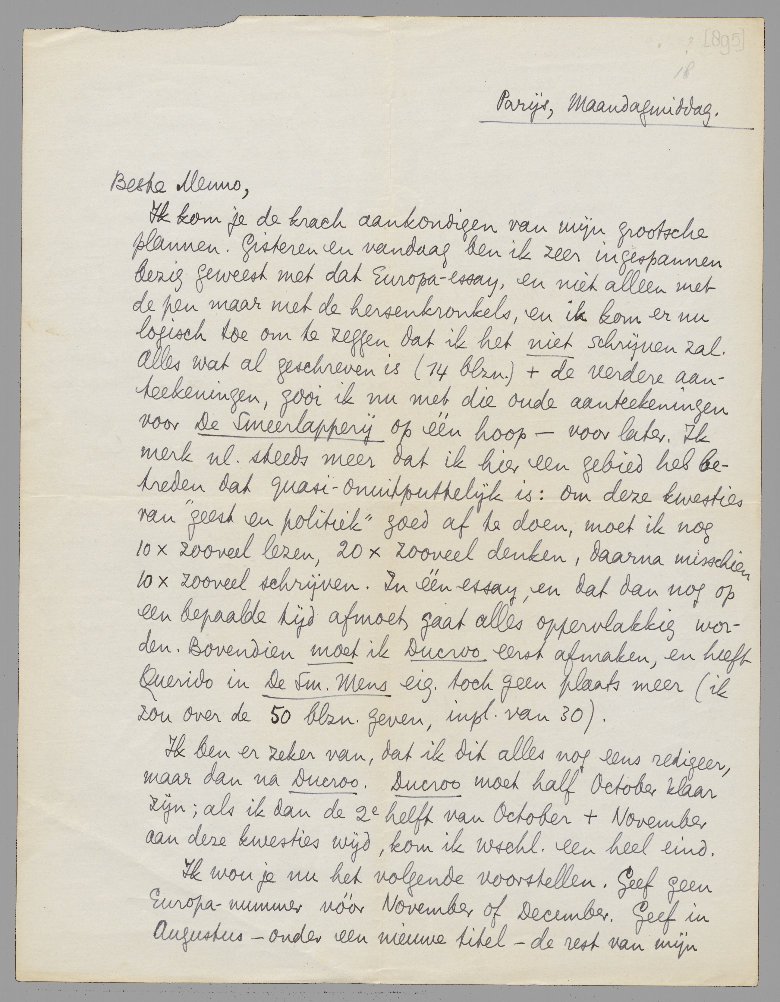 Ik kom je de krach aankondigen van mijn grootsche plannen. Gisteren en vandaag ben ik zeer ingespannen bezig geweest met dat Europa-essay, en niet alleen met de pen maar met de hersenkronkels, en ik kom er nu logisch toe om te zeggen dat ik het niet schrijven zal. Alles wat al geschreven is (14 blzn.) + de verdere aanteekeningen, gooi ik nu met die oude aanteekeningen voor De Smeerlapperij op één hoop - voor later. Ik merk nl. steeds meer dat ik hier een gebied heb betreden dat quasi-onuitputtelijk is: om deze kwesties van ‘geest en politiek’ goed af te doen, moet ik nog 10 × zooveel lezen, 20 × zooveel denken, daarna misschien 10 × zooveel schrijven. In één essay, en dat dan nog op een bepaalde tijd afmoet, gaat alles oppervlakkig worden. Bovendien moet ik Ducroo eerst afmaken, en heeft Querido in De Sm. Mens eig. toch geen plaats meer (ik zou over de 50 blzn. geven, inpl. van 30).