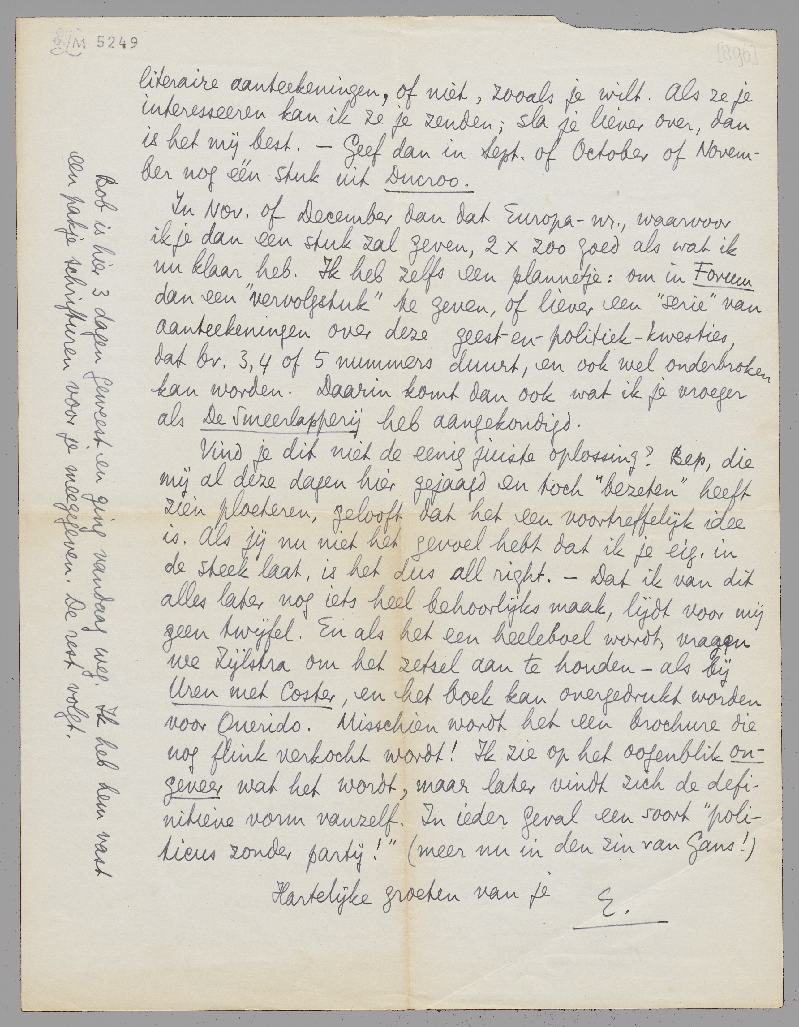 In Nov. of December dan dat Europa-nr., waarvoor ik je dan een stuk zal geven, 2 × zoo goed als wat ik nu klaar heb. Ik heb zelfs een plannetje; om in Forum dan een ‘vervolgstuk’ te geven, of liever een ‘serie’ van aanteekeningen over deze geest-en-politiek-kwesties, dat bv. 3, 4 of 5 nummers duurt, en ook wel onderbroken kan worden. Daarin komt dan ook wat ik je vroeger als De Smeerlapperij heb aangekondigd.