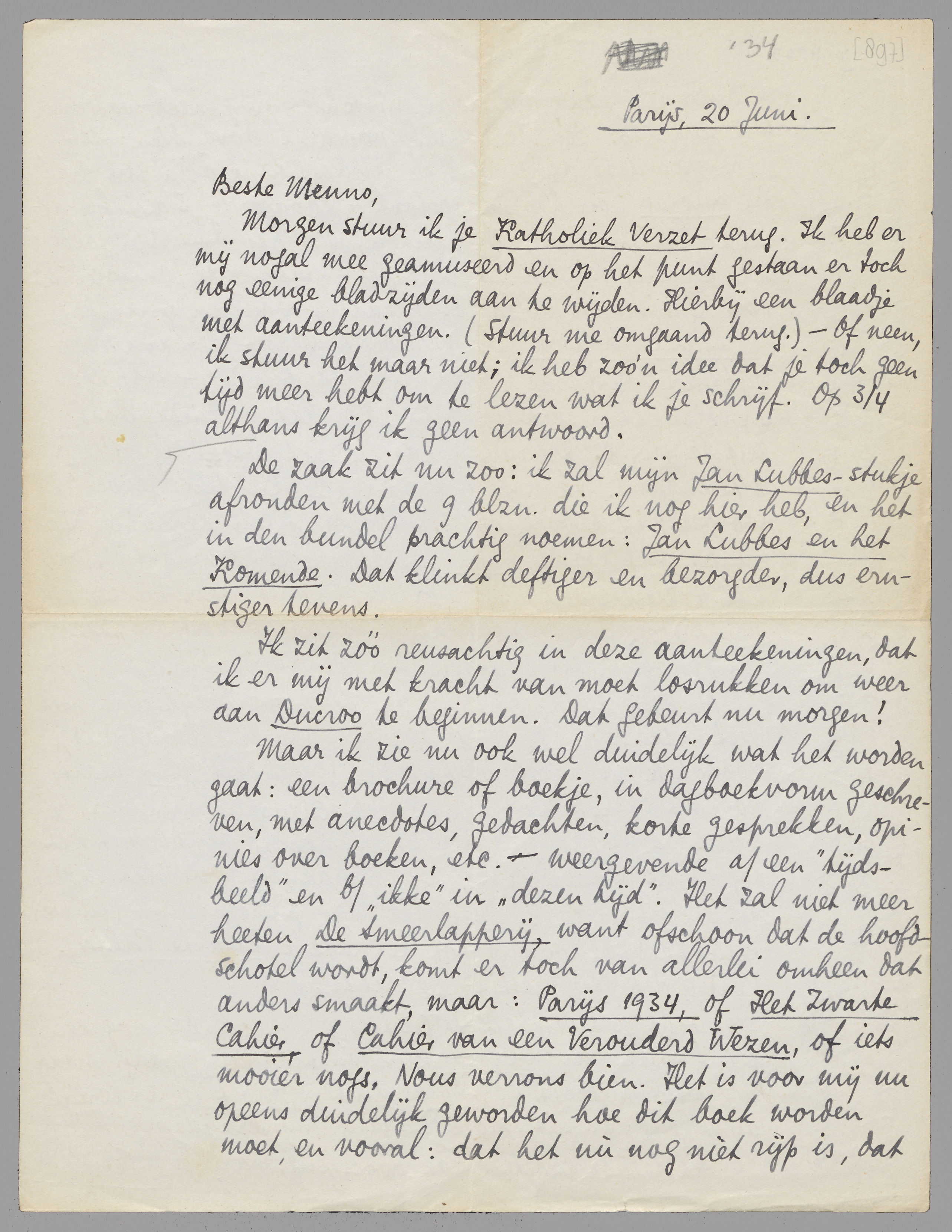Maar ik zie nu ook wel duidelijk wat het worden gaat: een brochure of boekje, in dagboekvorm geschreven, met anecdotes, gedachten, korte gesprekken, opinies over boeken, etc. - weergevende a) een ‘tijdsbeeld’ en b) ‘ikke’ in ‘dezen tijd’. Het zal niet meer heeten De Smeerlapperij, want ofschoon dat de hoofdschotel wordt, komt er toch van allerlei omheen dat anders smaakt, maar: Parijs 1934, of Het Zwarte Cahier, of Cahier van een Verouderd Wezen, of iets mooier nogs. Nous verrons bien. Het is voor mij nu opeens duidelijk geworden hoe dit boek worden moet en vooral: dat het nù nog niet rijp is, dat ik over een paar maanden misschien nog heel wat meer te zeggen heb. Eén belangrijk voordeel bovendien: een hoop van deze dingen die ik anders tant bien que mal in Ducroo zou hebben gestopt - zooals de Stavisky-affaire - blijft daar nu buiten, wat het boek ten goede zal komen, minder ‘hybridisch’ maken en ‘onmogelijk’ voor Querido en Holland. Maar ik wou nu maar dat De Smalle Mensch zóó verkocht werd - althans redelijkerwijs gesproken, voor een essaybundel - dat Q. er volstrekt niet tegenop zag om dat volgende boek uit te geven. Schrijven kan ik het wschl. in 1½ à 2½ maand. Ik voel het van alle kanten ‘gevoed’ worden; ik bedoel op, 2, 3, 4, ‘plans’ en ‘terreinen’ tegelijk. Het wordt mijn ‘politicus zonder partij’, dat zal je zien en gewaar worden, en met weer precies alle verschillen die er bestaan tusschen onze twee ‘zielen’ en ‘wezens’ en ‘geesten’ en ‘individuën’.