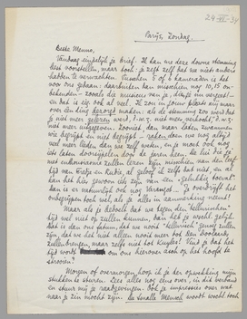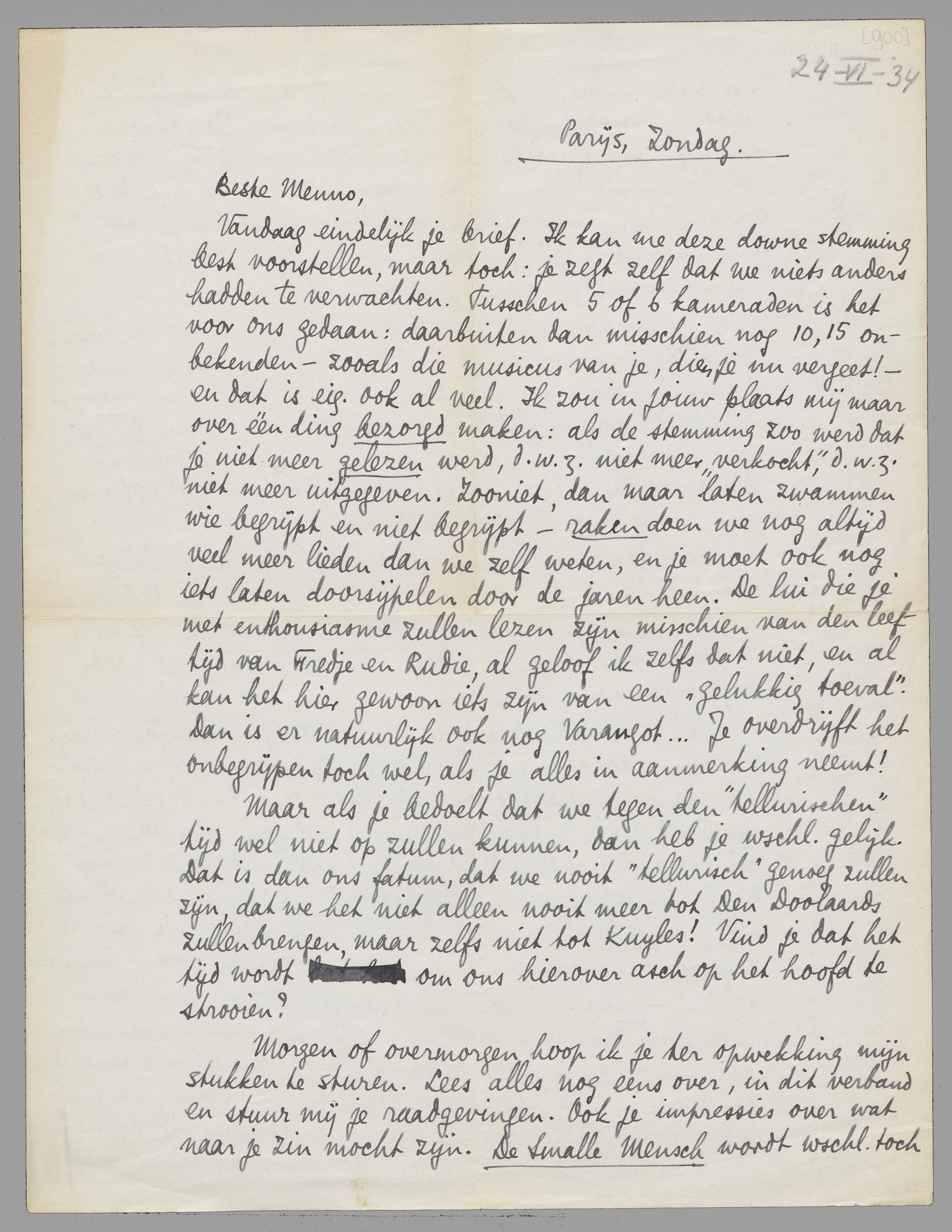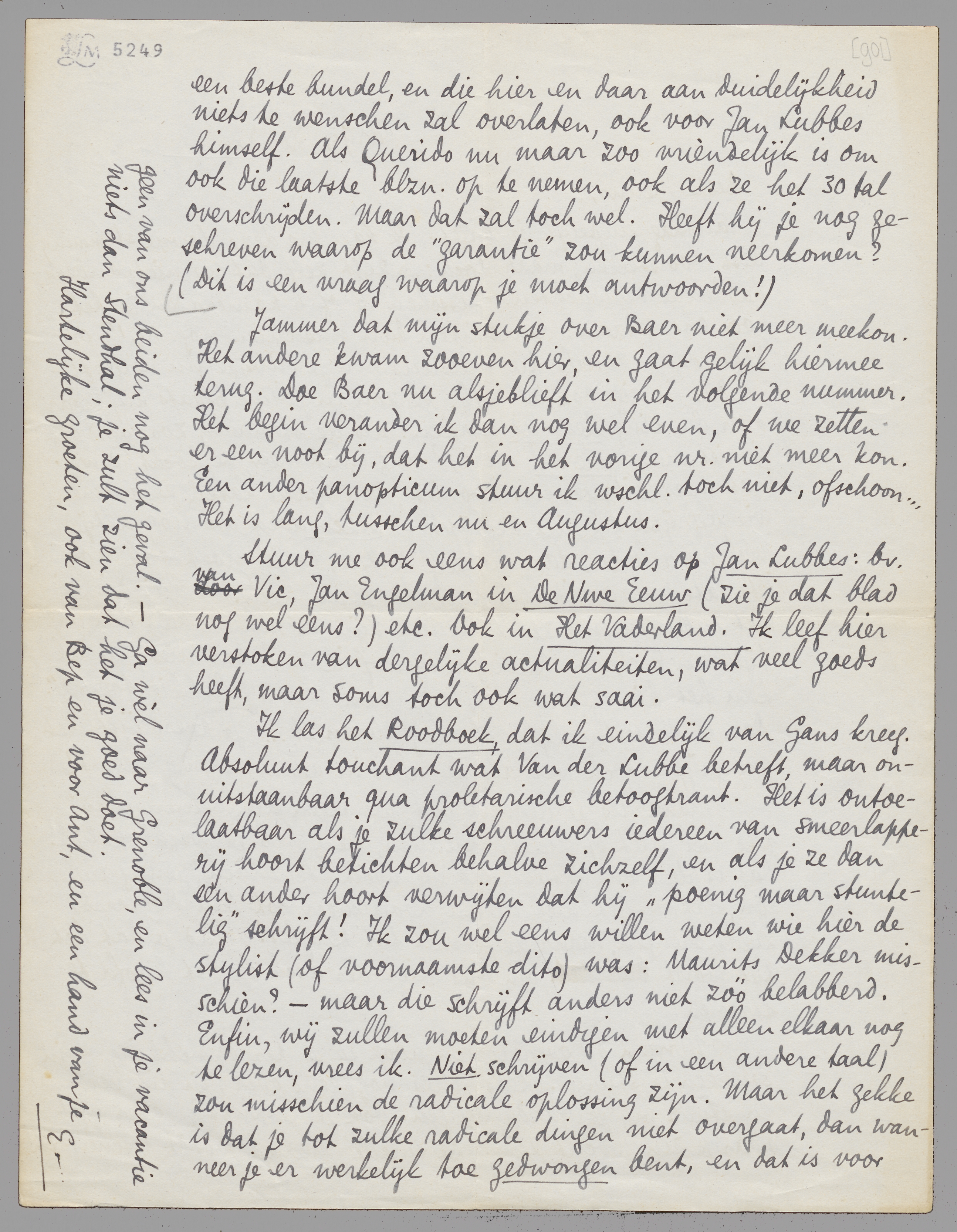 Morgen of overmorgen hoop ik je ter opwekking mijn stukken te sturen. Lees alles nog eens over, in dit verband en stuur mij je raadgevingen. Ook je impressies over wat naar je zin mocht zijn. De Smalle Mensch wordt wschl. toch een beste bundel, en die hier en daar aan duidelijkheid niets te wenschen zal overlaten, ook voor Jan Lubbes himself. Als Querido nu maar zoo vriendelijk is om ook die laatste blzn. op te nemen, ook als ze het 30 tal overschrijden. Maar dat zal toch wel. Heeft hij je nog geschreven waarop de ‘garantie’ zou kunnen neerkomen? (Dit is een vraag waarop je moet antwoorden!)