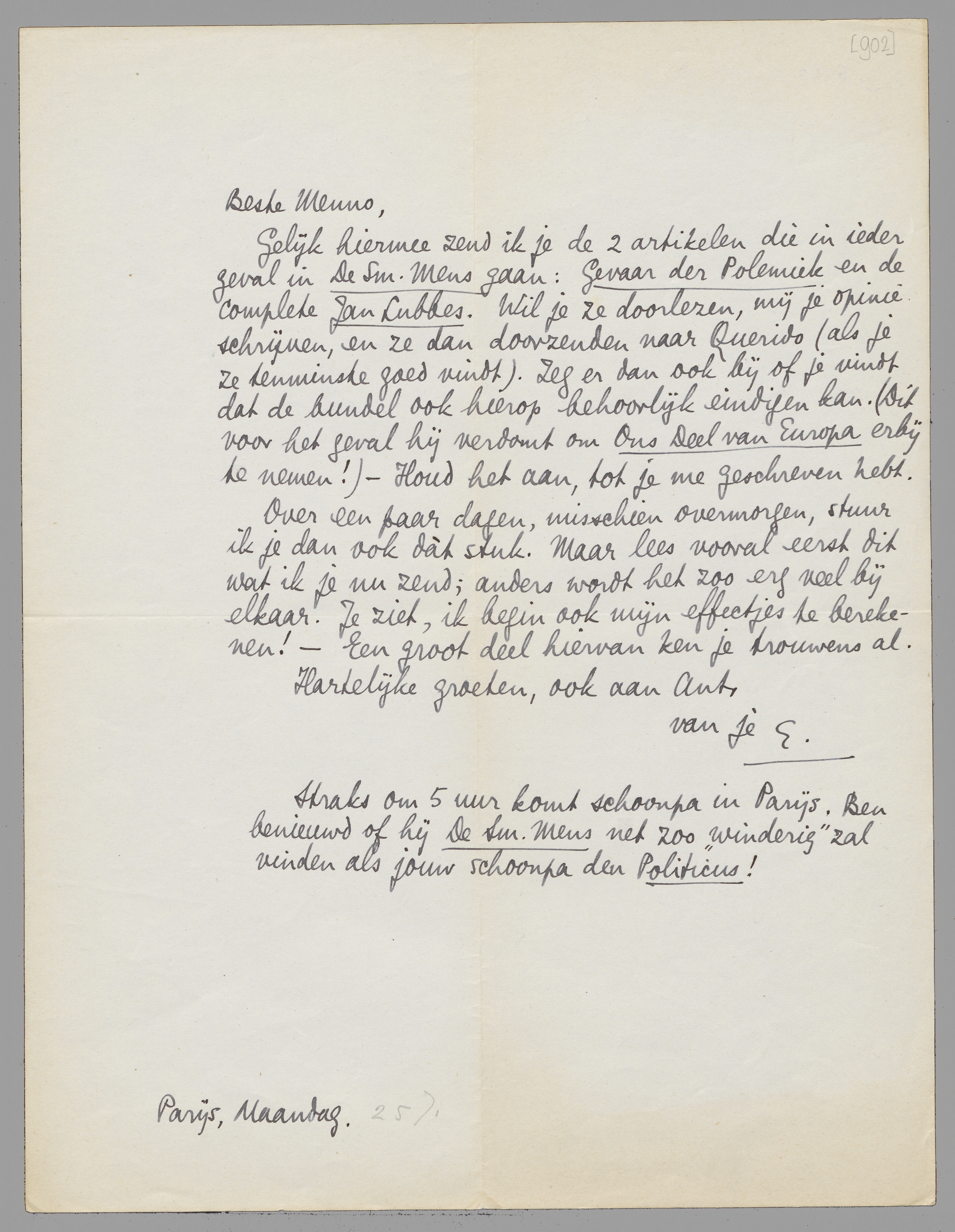 Gelijk hiermee zend ik je de 2 artikelen die in ieder geval in De Sm. Mens gaan: Gevaar der Polemiek en de complete Jan Lubbes. Wil je ze doorlezen, mij je opinie schrijven, en ze dan doorzenden naar Querido (als je ze tenminste goed vindt). Zeg er dan ook bij of je vindt dat de bundel ook hierop behoorlijk eindigen kan. (Dit voor het geval hij verdomt om Ons Deel van Europa erbij te nemen!) - Houd het aan, tot je me geschreven hebt.