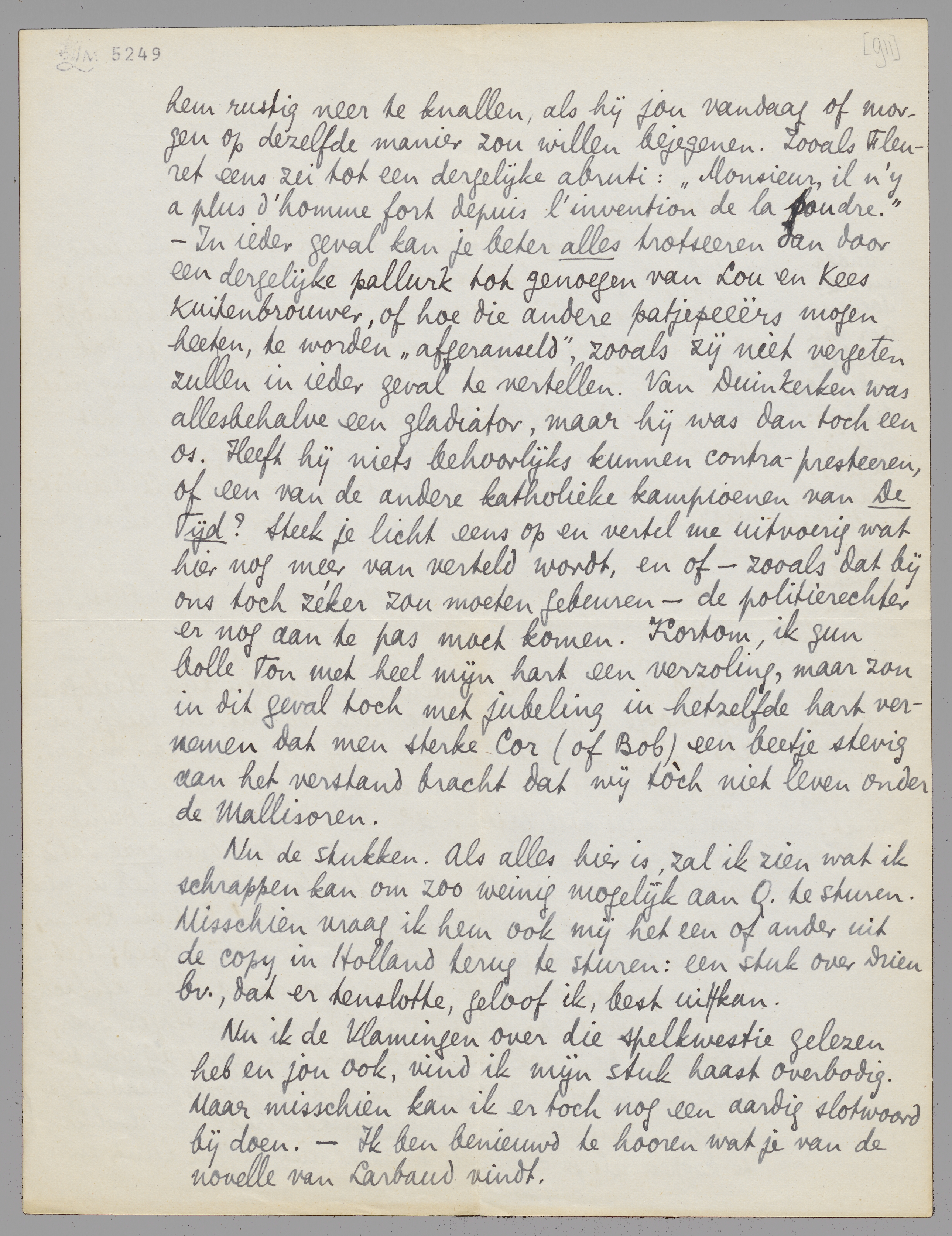 Ik wacht nu met ongeduld op je antwoord. Intusschen kan ik alvast je vorigen brief in details beantwoorden. 1o. Otten. Arme kerel! Ik wist wel dat hij op de een of andere manier de onbenulligheid van zijn ‘dialogen’ voor hooge wijsheid zou aanzien, en dat een boekje van zóó weinig gewicht hem toch nog topzwaar zou maken. Maar jij vindt het een beste kerel en dus zal je hem zijn illuzies wel laten. 2o. Den Doolaard-van Duinkerken. Geef me vooral nadere bizonderheden over onze nationale troebelen, want aan Duitschland alleen heb ik niet genoeg: ik heb bepaald appetijt gekregen! Dat die Roehm, die Heines zijn opgeruimd, doet me werkelijk goed; het is jammer dat alleen de eene slager den andere afslachten kan, want zoo blijft er altijd nog een slager over, maar hoe dan ook... Maar voor het geval bij ons te lande Den Doolaard tellurisch-razend wordt, raad ik je toch aan van den een of anderen kameraad een revolver te koopen, als je die in de winkels niet krijgen kunt en hem rustig neer te knallen, als hij jou vandaag of morgen op dezelfde manier zou willen bejegenen. Zooals Fleuret eens zei tot een dergelijke abruti: ‘Monsieur, il n'y a plus d'homme fort depuis l'invention de la poudre.’ - In ieder geval kan je beter alles trotseeren dan door een dergelijke pallurk tot genoegen van Lou en Kees Kuitenbrouwer, of hoe die andere patjepeeërs mogen heeten, te worden ‘afgeranseld’, zooals zij niet vergeten zullen in ieder geval te vertellen. Van Duinkerken was allesbehalve een gladiator, maar hij was dan toch een os. Heeft hij niets behoorlijks kunnen contra-presteeren, of een van de andere katholieke kampioenen van De Tijd? Steek je licht eens op en vertel me uitvoerig wat hier nog meer van verteld wordt, en of - zooals dat bij ons toch zéker zou moeten gebeuren - de politierechter er nog aan te pas moet komen. Kortom, ik gun bolle Ton met heel mijn hart een verzoling, maar zou in dit geval toch met jubeling in hetzelfde hart vernemen dat men sterke Cor (of Bob) een beetje stevig aan het verstand bracht dat wij tòch niet leven onder de Mallisoren.
