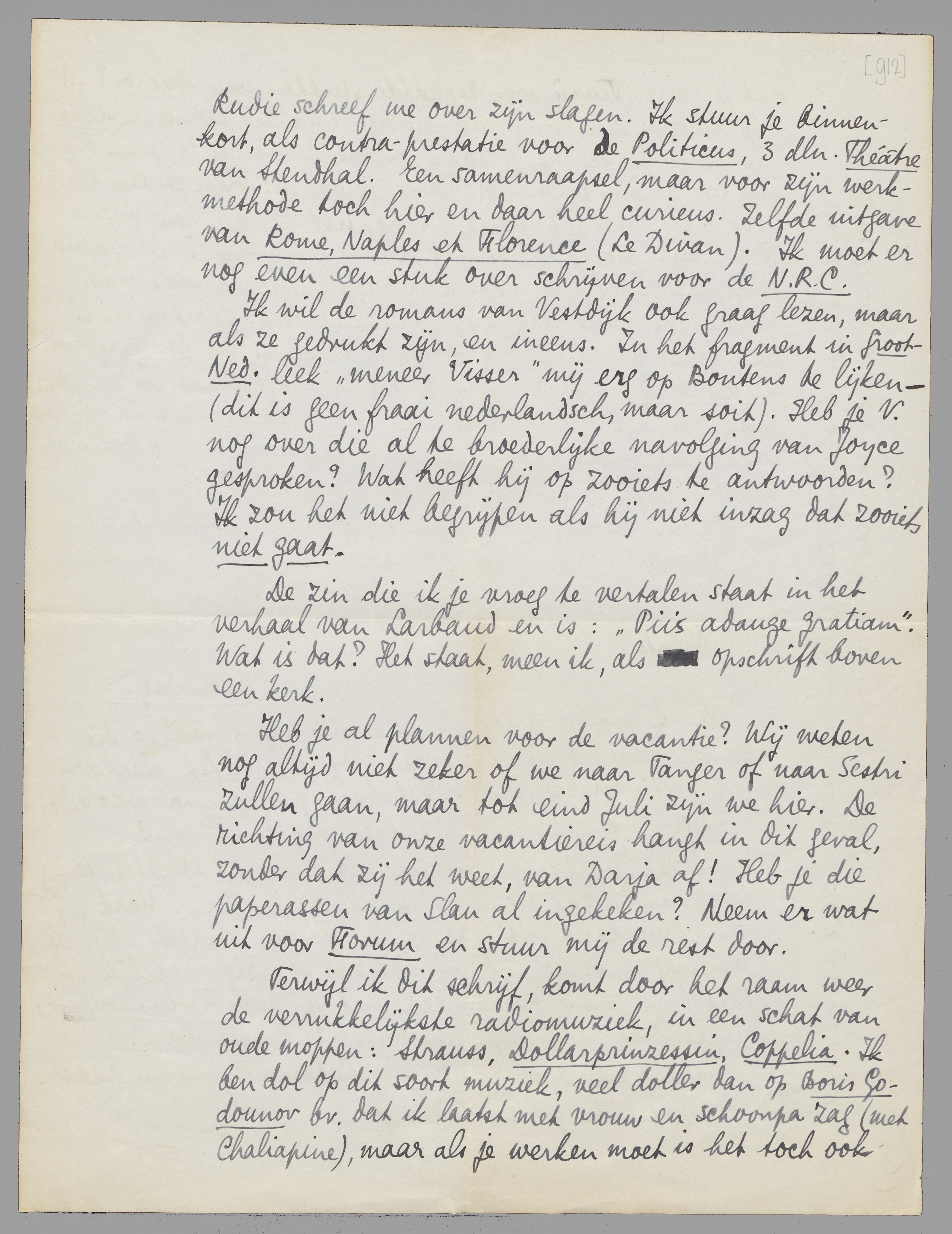 Rudie schreef me over zijn slagen. Ik stuur je binnenkort, als contra-prestatie voor de Politicus, 3 dln. Théâtre van Stendhal. Een samenraapsel, maar voor zijn werkmethode toch hier en daar heel curieus. Zelfde uitgave van Rome, Naples et Florence (Le Divan). Ik moet er nog even een stuk over schrijven voor de N.R.C.