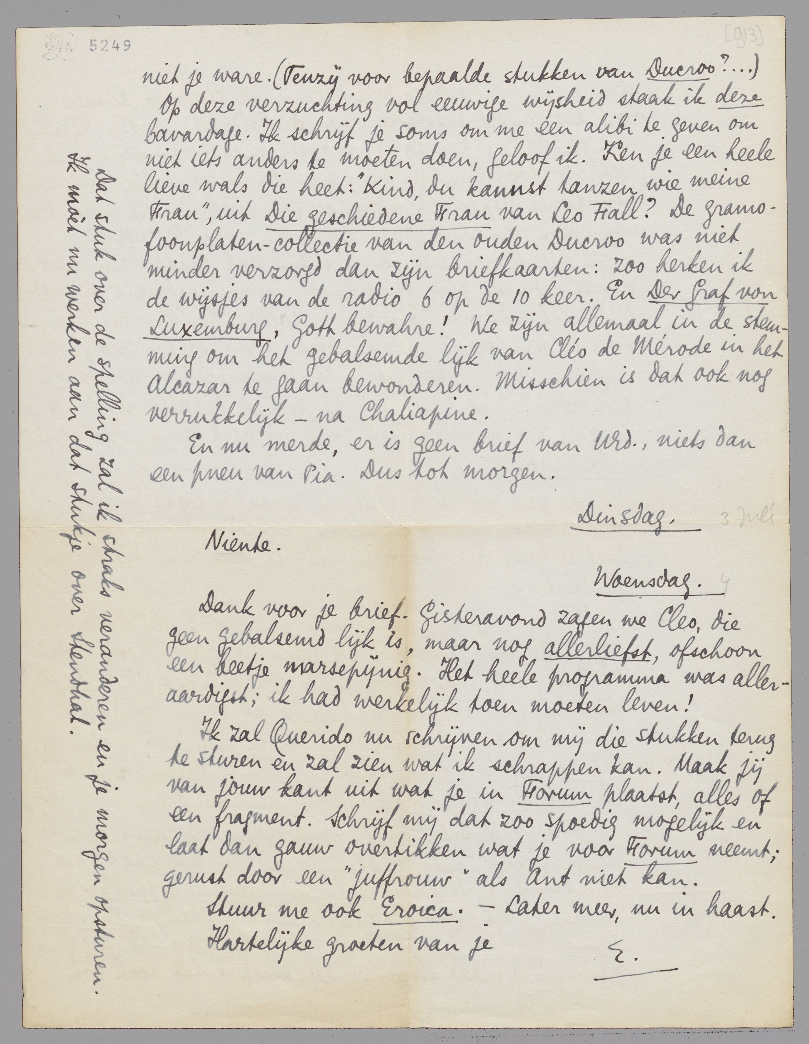Op deze verzuchting vol eeuwige wijsheid staak ik deze bavardage. Ik schrijf je soms om me een alibi te geven om niet iets anders te moeten doen, geloof ik. Ken je een heele lieve wals die heet: ‘Kind, du kannst tanzen wie meine Frau’, uit Die geschiedene Frau van Leo Fall? De gramofoonplaten-collectie van den ouden Ducroo was niet minder verzorgd dan zijn briefkaarten: zoo herken ik de wijsjes van de radio 6 op de 10 keer. En Der Graf von Luxemburg, Gott bewahre! We zijn allemaal in de stemming om het gebalsemde lijk van Cléo de Mérode in het Alcazar te gaan bewonderen. Misschien is dat ook nog verrukkelijk - na Chaliapine.
