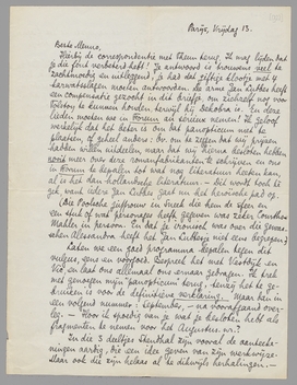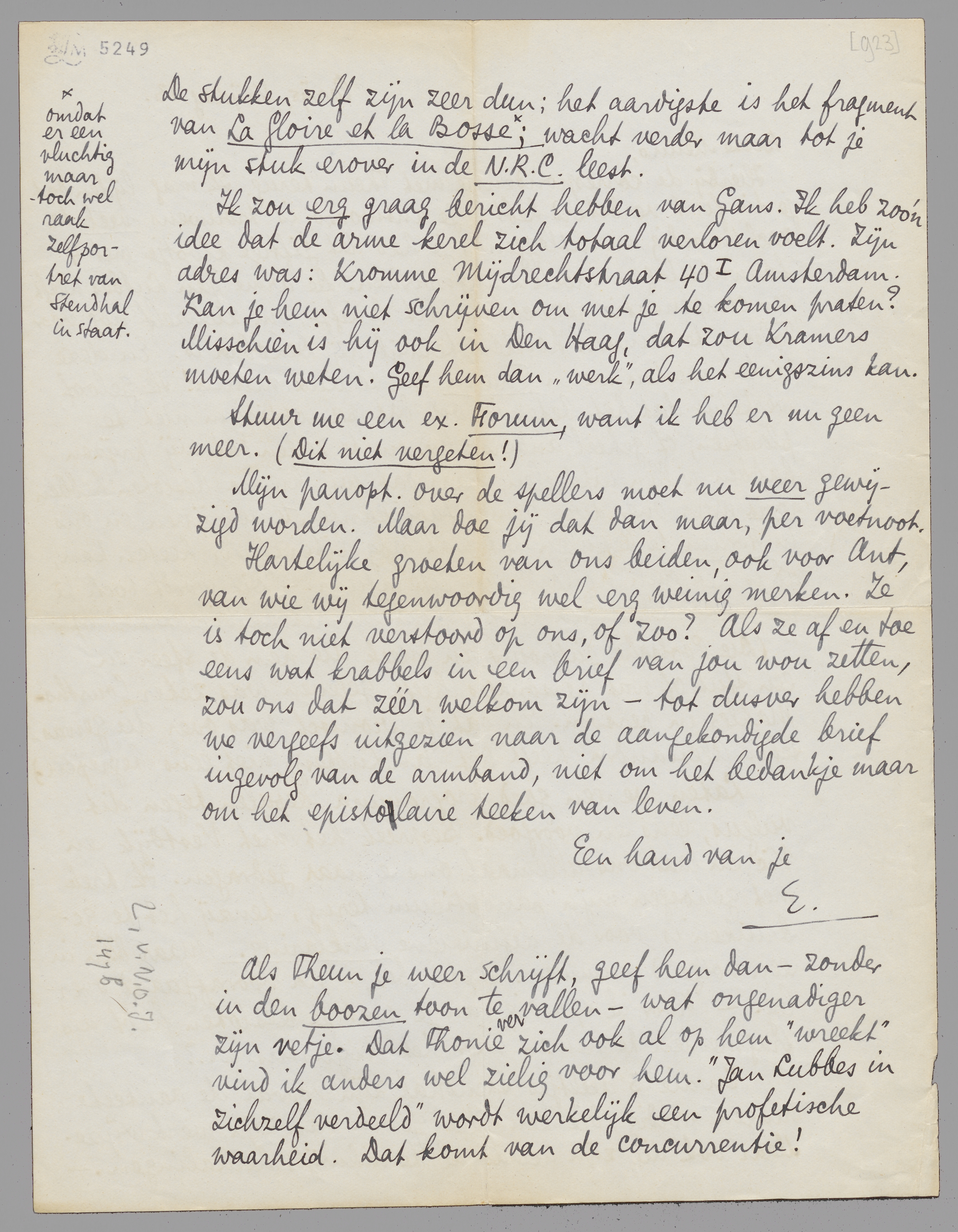 Ik zou erg graag bericht hebben van Gans. Ik heb zoo'n idee dat de arme kerel zich totaal verloren voelt. Zijn adres was: Kromme Mijdrechtstraat 401 Amsterdam. Kan je hem niet schrijven om met je te komen praten? Misschien is hij ook in Den Haag, dat zou Kramers moeten weten. Geef hem dan ‘werk’, als het eenigszins kan.