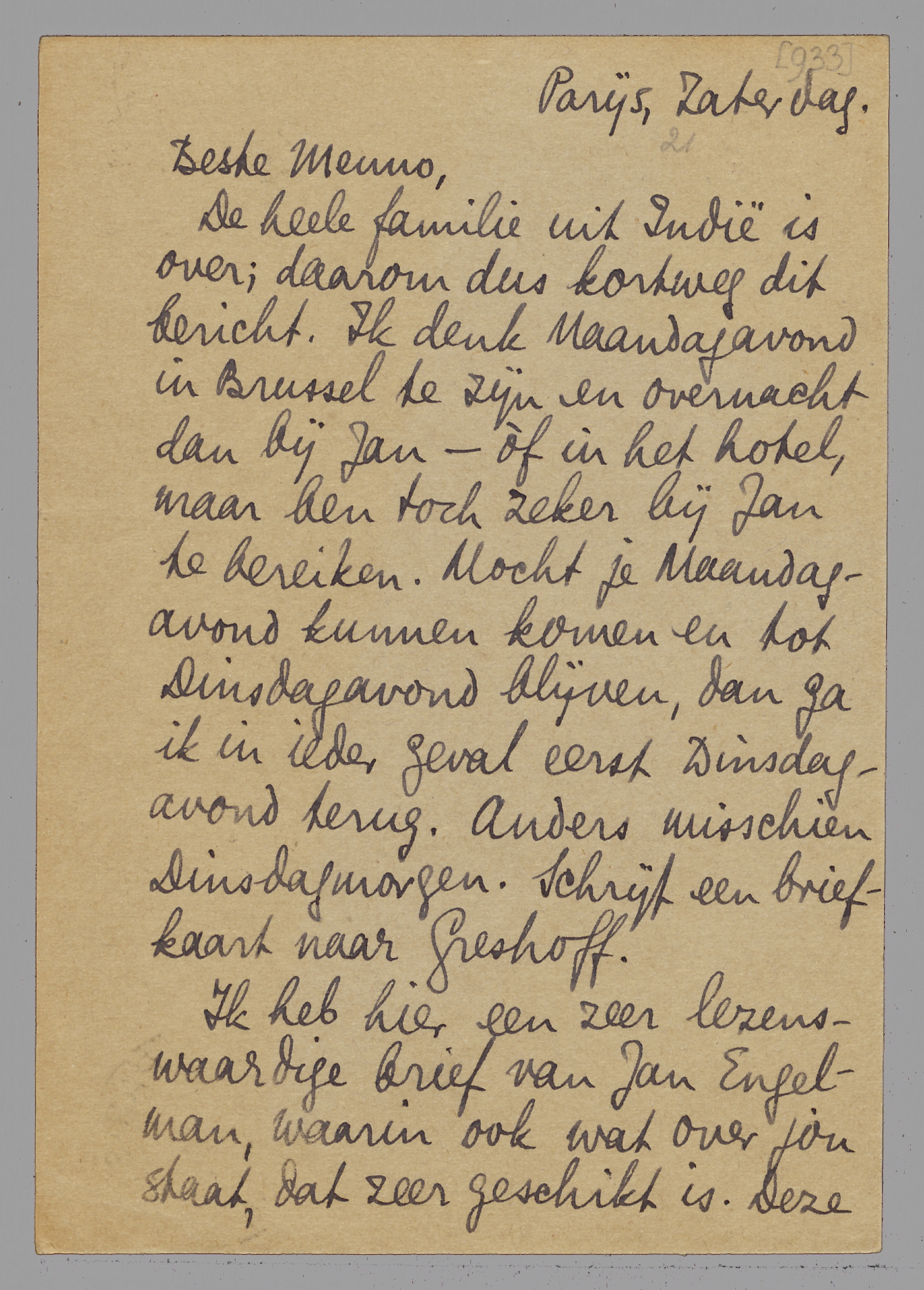 De heele familie uit Indië is over; daarom dus kortweg dit bericht. Ik denk Maandagavond in Brussel te zijn en overnacht dan bij Jan - òf in het hotel, maar ben toch zeker bij Jan te bereiken. Mocht je Maandagavond kunnen komen en tot Dinsdagavond blijven, dan ga ik in ieder geval eerst Dinsdagavond terug. Anders misschien Dinsdagmorgen. Schrijf een briefkaart naar Greshoff.
