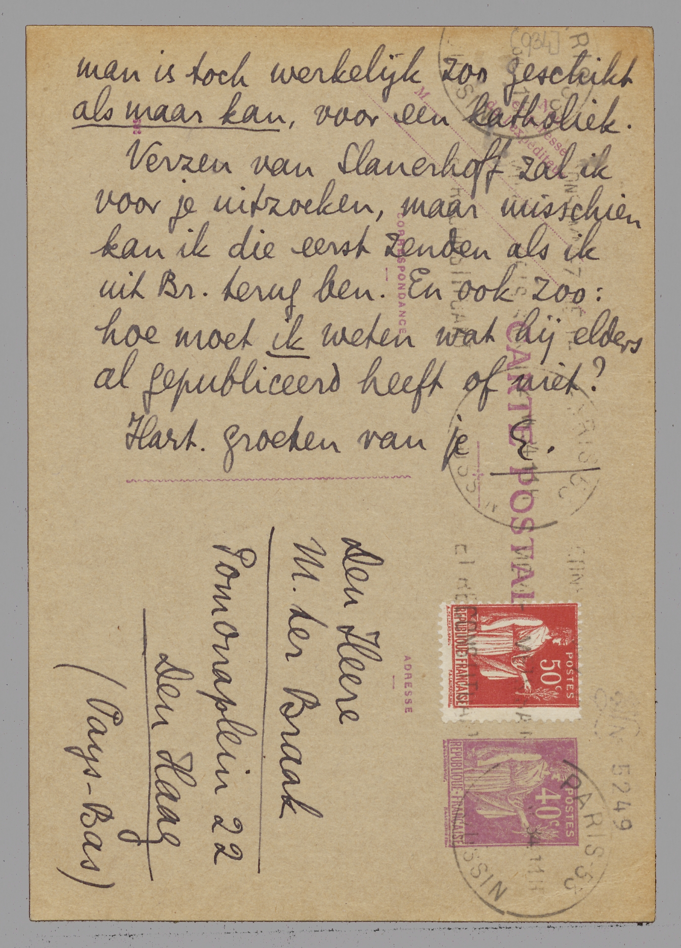 Ik heb hier een zeer lezenswaardige brief van Jan Engelman, waarin ook wat over jou staat, dat zeer geschikt is. Deze man is toch werkelijk zoo geschikt als maar kan, voor een katholiek. Verzen van Slauerhoff zal ik voor je uitzoeken, maar misschien kan ik die eerst zenden als ik uit Br. terug ben. En ook zoo: hoe moet ik weten wat hij elders al gepubliceerd heeft of niet? Hart. groeten van je