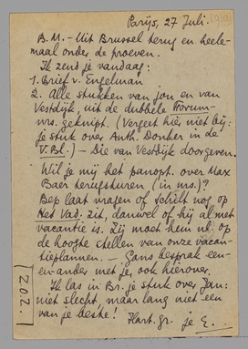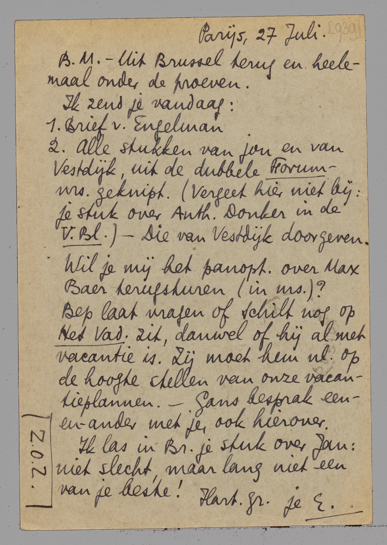 | 2. | Alle stukken van jou en van Vestdijk, uit de dubbele Forum-nrs. geknipt. (Vergeet hier niet bij: je stuk over Anth. Donker in de V.Bl.) - Die van Vestdijk doorgeven. Wil je mij het panopt. over Max Baer terugsturen (in ms.)? |