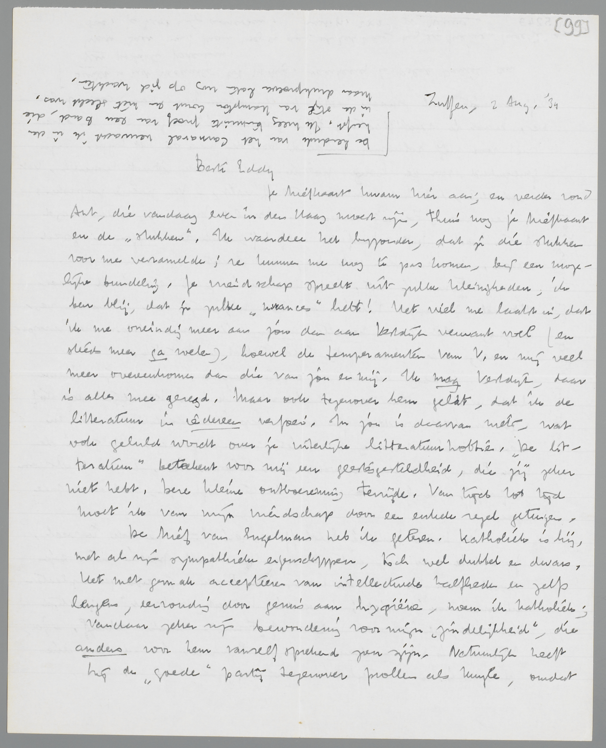 Je briefkaart kwam hier aan; en verder vond Ant, die vandaag even in den Haag moest zijn, thuis nog je briefkaart en de ‘stukken’. Ik waardeer het bijzonder, dat je die stukken voor me verzamelde; ze kunnen me nog te pas komen, bij een mogelijke bundeling. Je vriendschap spreekt uit zulke kleinigheden, ik ben blij, dat je zulke ‘nuances’ hebt! Het viel me laatst in, dat ik me oneindig meer aan jou dan aan Vestdijk verwant voel (en steeds meer ga voelen), hoewel de temperamenten van V. en mij veel meer overeenkomen dan die van jou en mij. Ik mag Vestdijk, daar is alles mee gezegd. Maar ook tegenover hem geldt, dat ik de litteratuur in iedereen verfoei. In jou is daarvan niets, wat ook geluld wordt over je uiterlijke litteratuurhobbies. ‘De litteratuur’ beteekent voor mij een geestesgesteldheid, die jij zeker niet hebt. Deze kleine ontboezeming terzijde. Van tijd tot tijd moet ik van mijn vriendschap door een enkele regel getuigen.