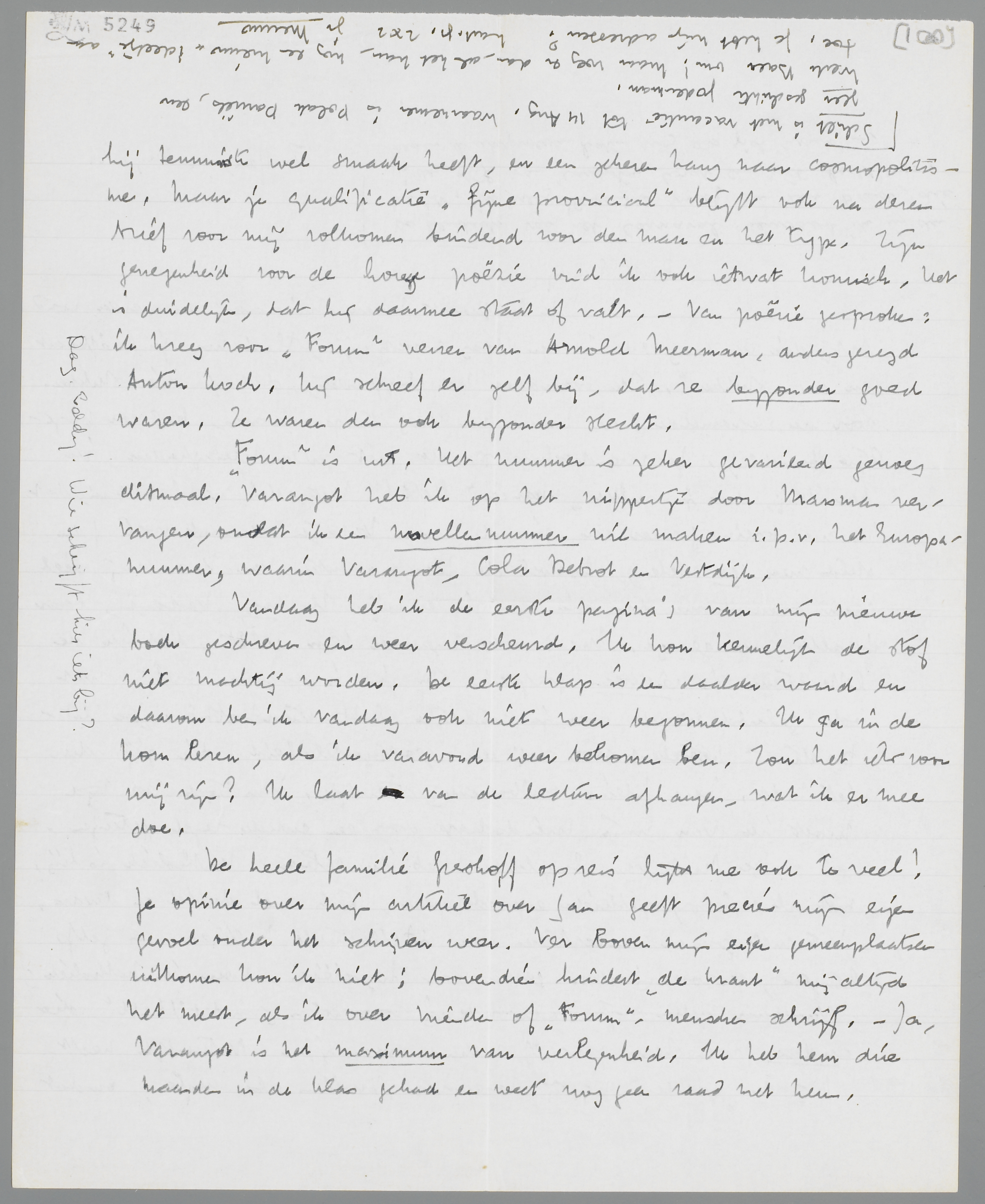 Forum is uit. Het nummer is zeker gevarieerd genoeg ditmaal. Varangot heb ik op het nippertje door Marsman vervangen, omdat ik een novellen nummer wil maken i.p.v. het Europanummer, waarin Varangot, Cola Debrot en Vestdijk.