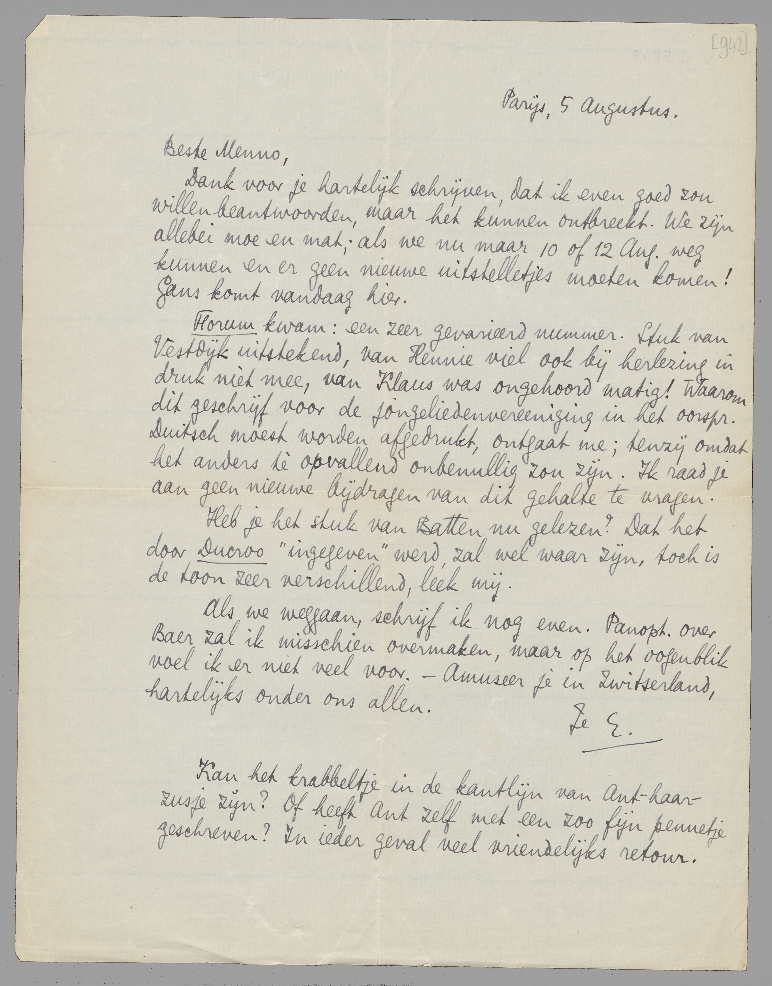 Forum kwam: een zeer gevarieerd nummer. Stuk van Vestdijk uitstekend, van Hennie viel ook bij herlezing in druk niet mee, van Klaus was ongehoord matig! Waarom dit geschrijf voor de jongeliedenvereeniging in het oorspr. Duitsch moest worden afgedrukt, ontgaat me; tenzij omdat het anders tè opvallend onbenullig zou zijn. Ik raad je aan geen nieuwe bijdragen van dit gehalte te vragen.