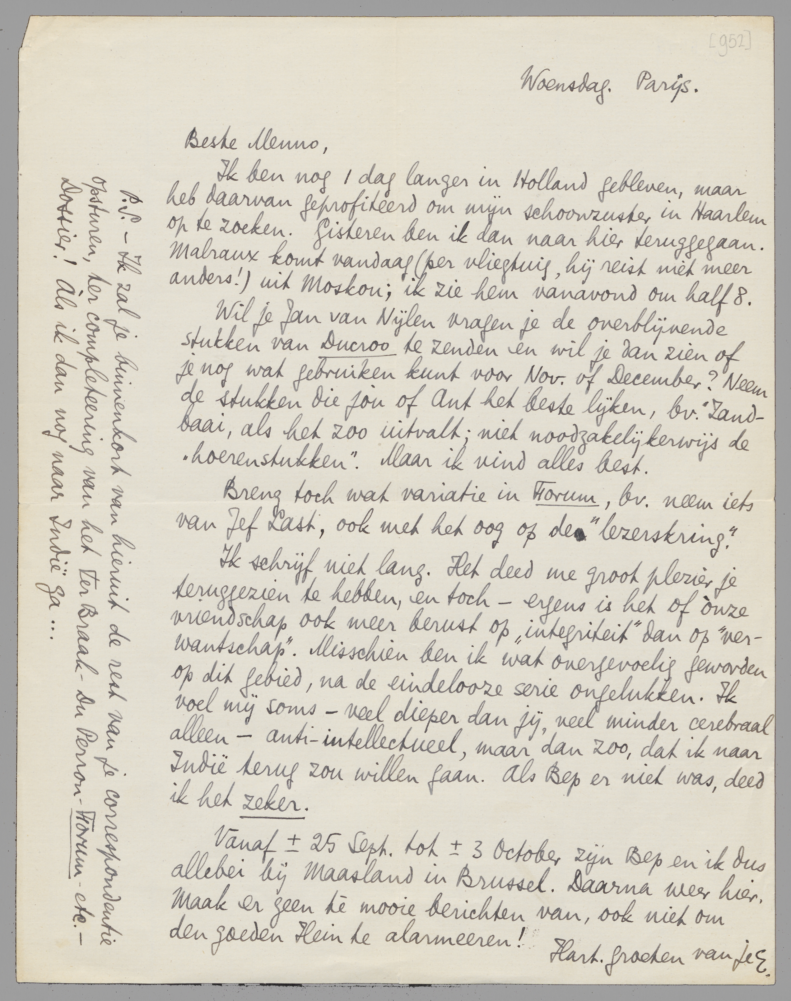 Wil je Jan van Nijlen vragen je de overblijvende stukken van Ducroo te zenden en wil je dan zien of je nog wat gebruiken kunt voor Nov. of December? Neem de stukken die jou of Ant het beste lijken, b.v. Zandbaai, als het zoo uitvalt; niet noodzakelijkerwijs de ‘hoerenstukken’. Maar ik vind alles best.