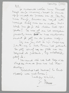 Je onverwacht vertrek naar Brussel brengt eenige verwarring. Want ik stuurde op je verzoek de proeven van de Sm. M. naar Parijs, benevens een nogal uitvoerige brief over een en ander. Misschien kun je je die stukken laten opzenden? Ik was al aan het corrigeeren geweest, maar was er mee opgehouden omdat je zelf om de proeven vroeg.