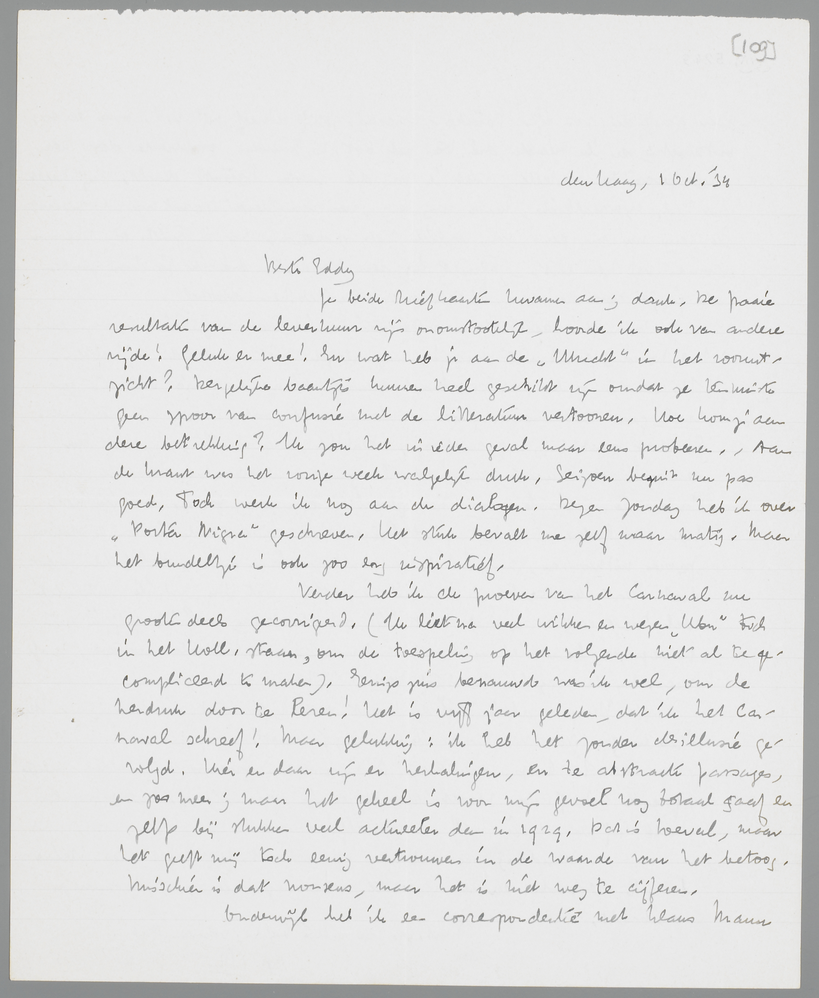 Verder heb ik de proeven van het Carnaval nu grootendeels gecorrigeerd. (Ik liet na veel wikken en wegen Ubu toch in het Holl. staan, om de toespeling op het volgende niet al te gecompliceerd te maken). Eenigszins benauwd was ik wel, om de herdruk door te lezen! Het is vijf jaar geleden, dat ik het Carnaval schreef! Maar gelukkig; ik heb het zonder desillusie gevolgd. Hier en daar zijn er herhalingen, en te abstracte passages, en zoo meer; maar het geheel is voor mijn gevoel nog totaal gaaf en zelfs bij stukken veel actueeler dan in 1929. Dat is toeval, maar het geeft mij toch eenig vertrouwen in de waarde van het betoog. Misschien is dat nonsens, maar het is niet weg te cijferen.