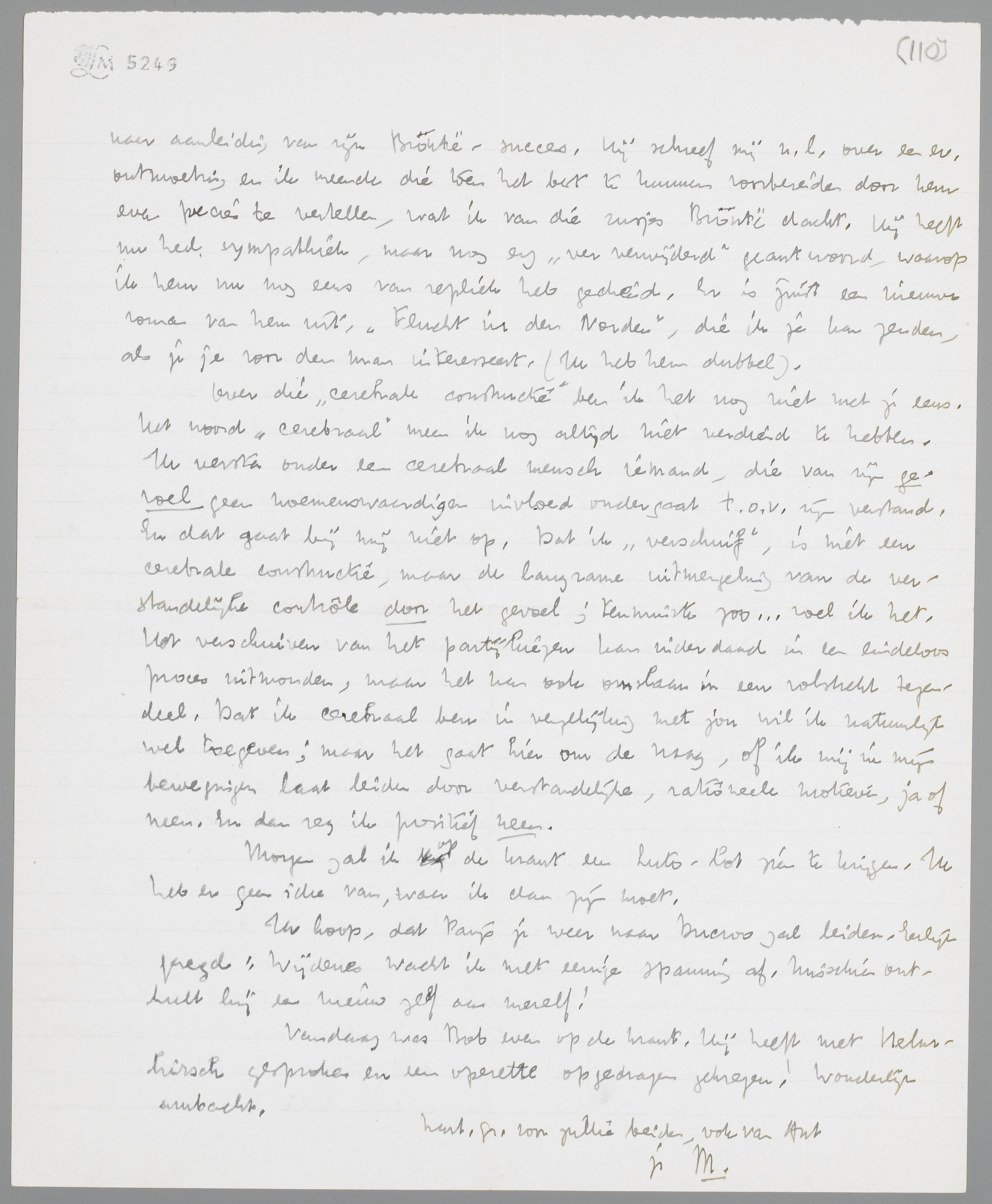 Over die ‘cerebrale constructie’ ben ik het nog niet met je eens. Het woord ‘cerebraal’ meen ik nog altijd niet verdiend te hebben. Ik versta onder een cerebraal mensch iemand, die van zijn gevoel geen noemenswaardigen invloed ondergaat t.o.v. zijn verstand. En dat gaat bij mij niet op. Dat ik ‘verschuif’, is niet een cerebrale constructie, maar de langzame uitmergeling van de verstandelijke contrôle door het gevoel; tenminste zoo... voel ik het. Het verschuiven van het partijkiezen kan inderdaad in een eindeloos proces uitmonden, maar het kan ook omslaan in een volstrekt tegendeel. Dat ik cerebraal ben in vergelijking met jou wil ik natuurlijk wel toegeven; maar het gaat hier om de vraag, of ik mij in mijn bewegingen laat leiden door verstandelijke, rationeele motieven, ja of neen. En dan zeg ik positief neen.