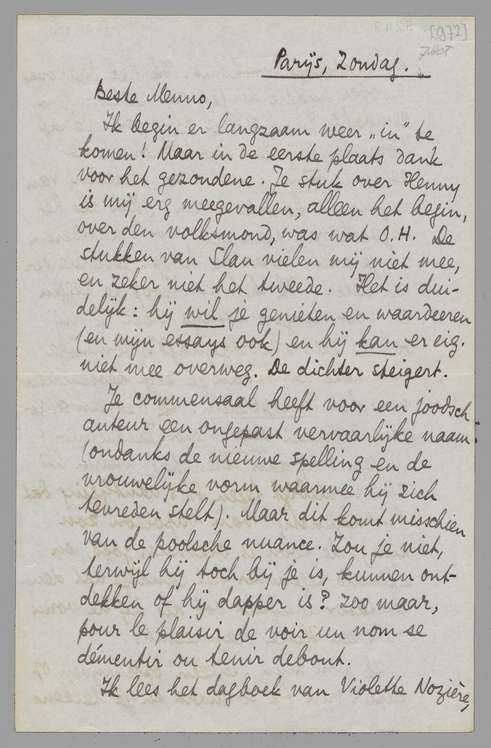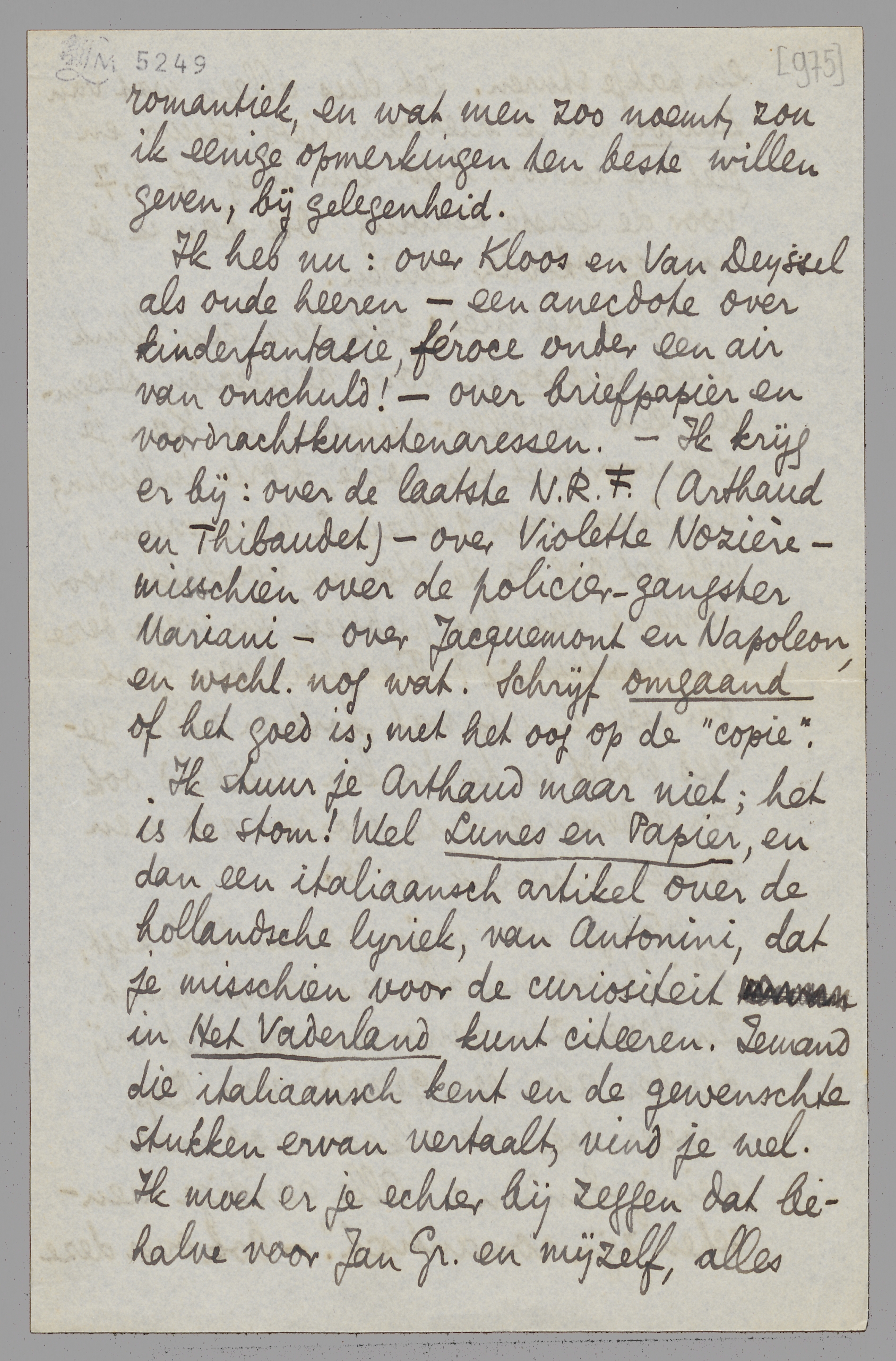Ik heb nu: over Kloos en Van Deyssel als oude heeren - een anecdote over kinderfantasie, féroce onder een air van onschuld! - over briefpapier en voordrachtkunstenaressen. - Ik krijg er bij: over de laatste N.R.F. (Arthaud en Thibaudet) - over Violette Nozière - misschien over de policier-gangster Mariani - over Jacquemont en Napoleon, en wschl. nog wat. Schrijf omgaand of het goed is, met het oog op de ‘copie’.