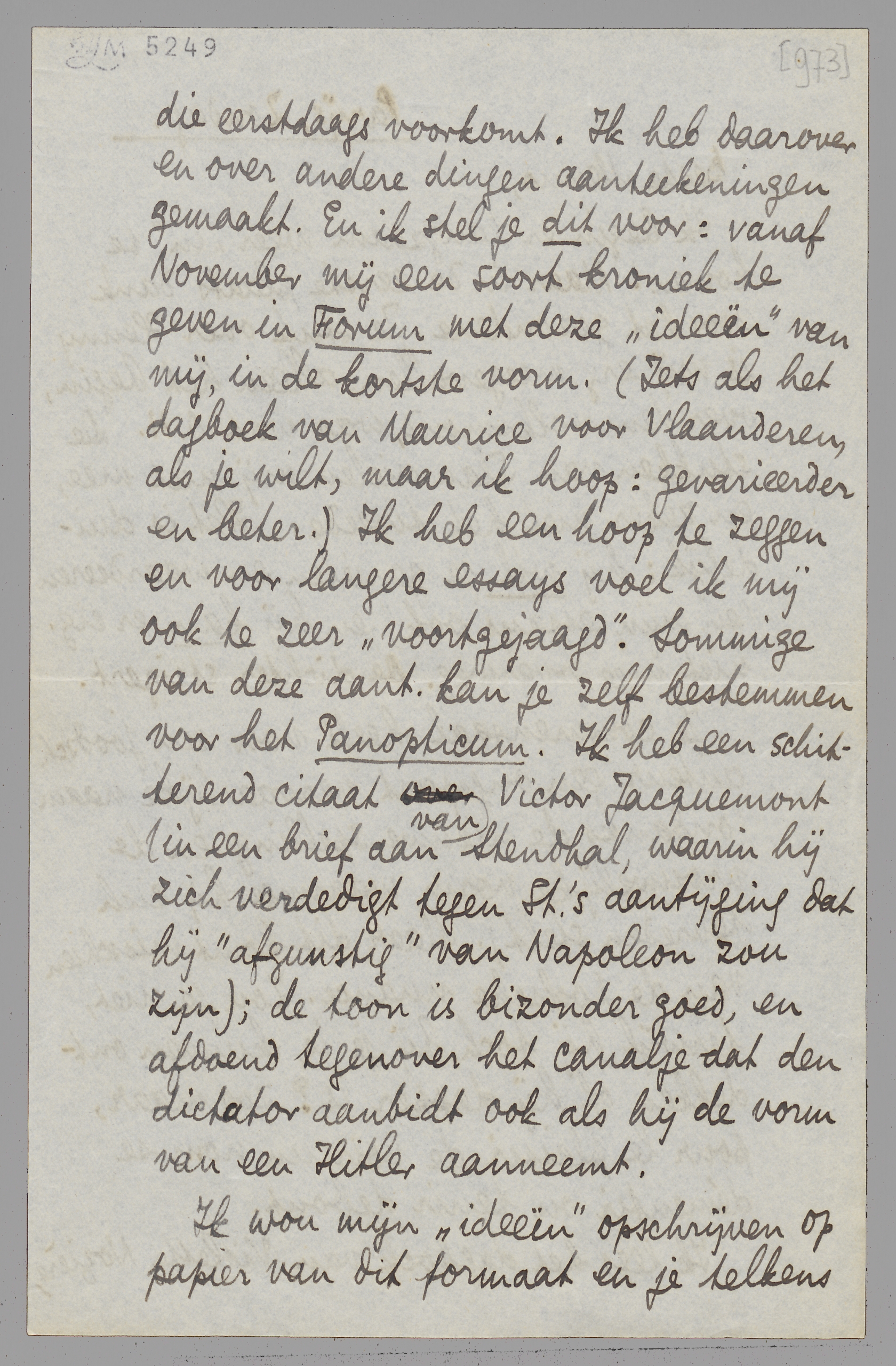 Ik lees het dagboek van Violette Nozière, die eerstdaags voorkomt. Ik heb daarover en over andere dingen aanteekeningen gemaakt. En ik stel je dit voor: vanaf November mij een soort kroniek te geven in Forum met deze ‘ideeën’ van mij, in de kortste vorm. (Iets als het dagboek van Maurice voor Vlaanderen, als je wilt, maar ik hoop: gevarieerder en beter.) Ik heb een hoop te zeggen en voor langere essays voel ik mij ook te zeer ‘voortgejaagd’. Sommige van deze aant. kan je zelf bestemmen voor het Panopticum. Ik heb een schitterend citaat van Victor Jacquemont (in een brief aan Stendhal, waarin hij zich verdedigt tegen St.'s aantijging dat hij ‘afgunstig’ van Napoleon zou zijn); de toon is bizonder goed, en afdoend tegenover het canalje dat den dictator aanbidt ook als hij de vorm van een Hitler aanneemt.