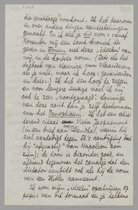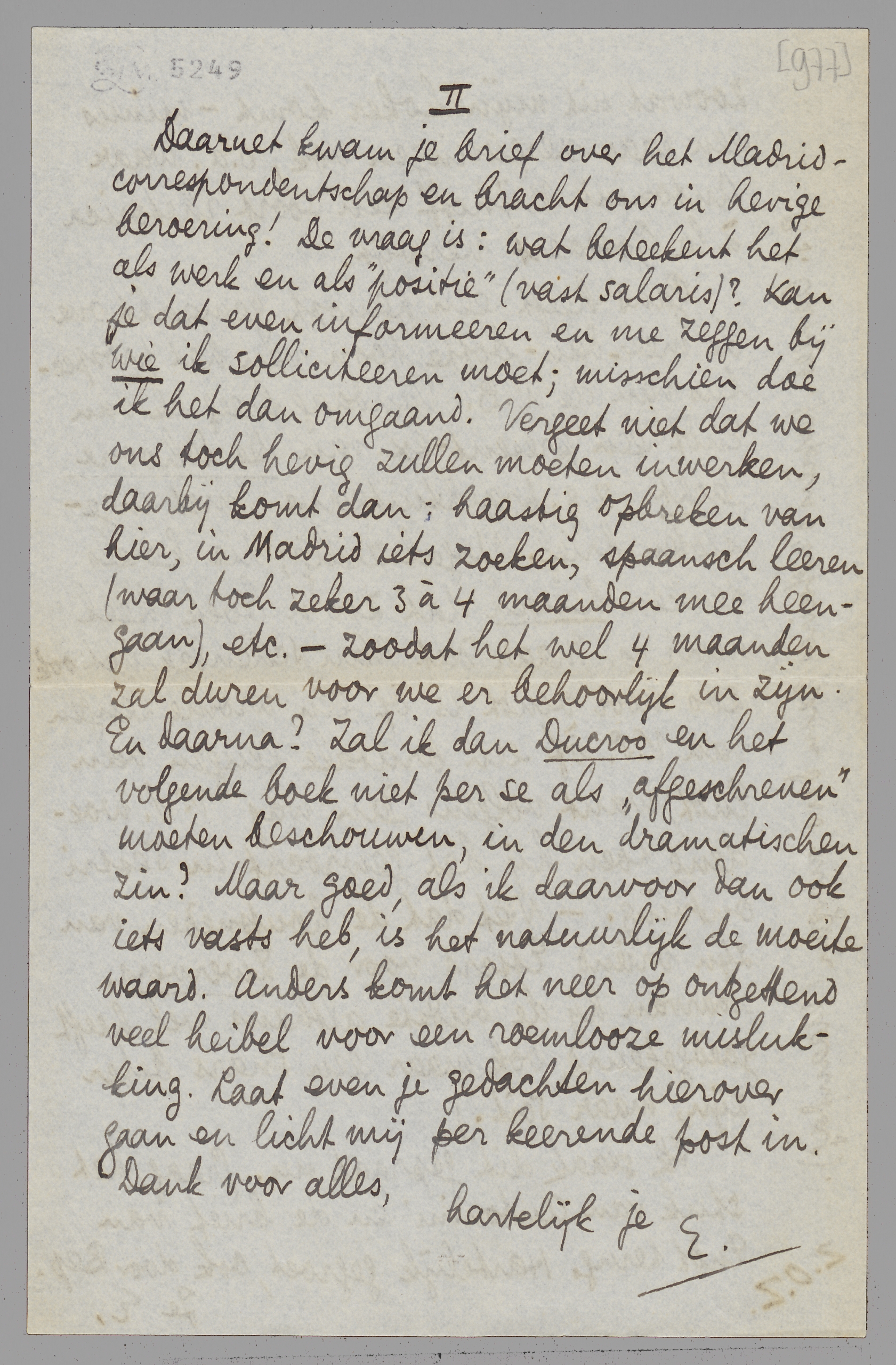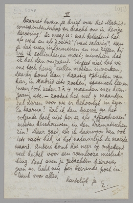 Daarnet kwam je brief over het Madrid-correspondentschap en bracht ons in hevige beroering! De vraag is: wat beteekent het als werk en als ‘positie’ (vast salaris?). Kan je dat informeeren en me zeggen bij wie ik solliciteeren moet; misschien doe ik het dan omgaand. Vergeet niet dat we ons toch hevig zullen moeten inwerken, daarbij komt dan: haastig opbreken van hier, in Madrid iets zoeken, spaansch leeren (waar toch zeker 3 à 4 maanden mee heengaan), etc. - zoodat het wel 4 maanden zal duren voor we er behoorlijk in zijn. En daarna? Zal ik dan Ducroo en het volgende boek niet per se als ‘afgeschreven’ moeten beschouwen, in den dramatischen zin? Maar goed, als ik daarvoor dan ook iets vasts heb, is het natuurlijk de moeite waard. Anders komt het neer op ontzettend veel heibel voor een roemlooze mislukking. Laat even je gedachten hierover gaan en licht mij per keerende post in.