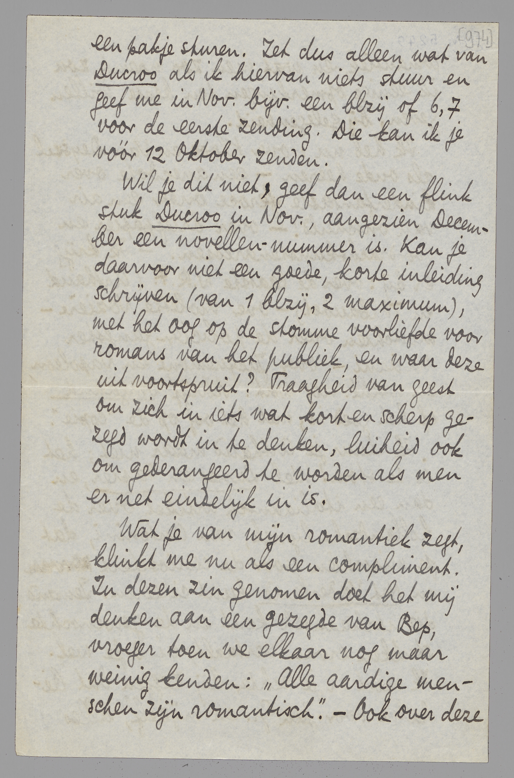 Wil je dit niet, geef dan een flink stuk Ducroo in Nov., aangezien December een novellen-nummer is. Kan je daarvoor niet een goede, korte inleiding schrijven (van 1 blzij, 2 maximum), met het oog op de stomme voorliefde voor romans van het publiek, en waar deze uit voortspruit? Traagheid van geest om zich in iets wat kort en scherp gezegd wordt in te denken, luiheid ook om gederangeerd te worden als men er net eindelijk in is.