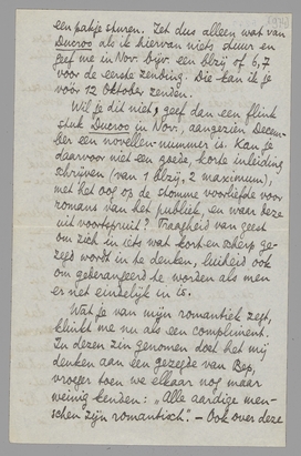 Wat je van mijn romantiek zegt, klinkt me nu als een compliment. In dezen zin genomen doet het mij denken aan een gezegde van Bep, vroeger toen we elkaar nog maar weinig kenden: ‘Alle aardige menschen zijn romantisch’. - Ook over deze romantiek, en wat men zoo noemt, zou ik eenige opmerkingen ten beste willen geven, bij gelegenheid.